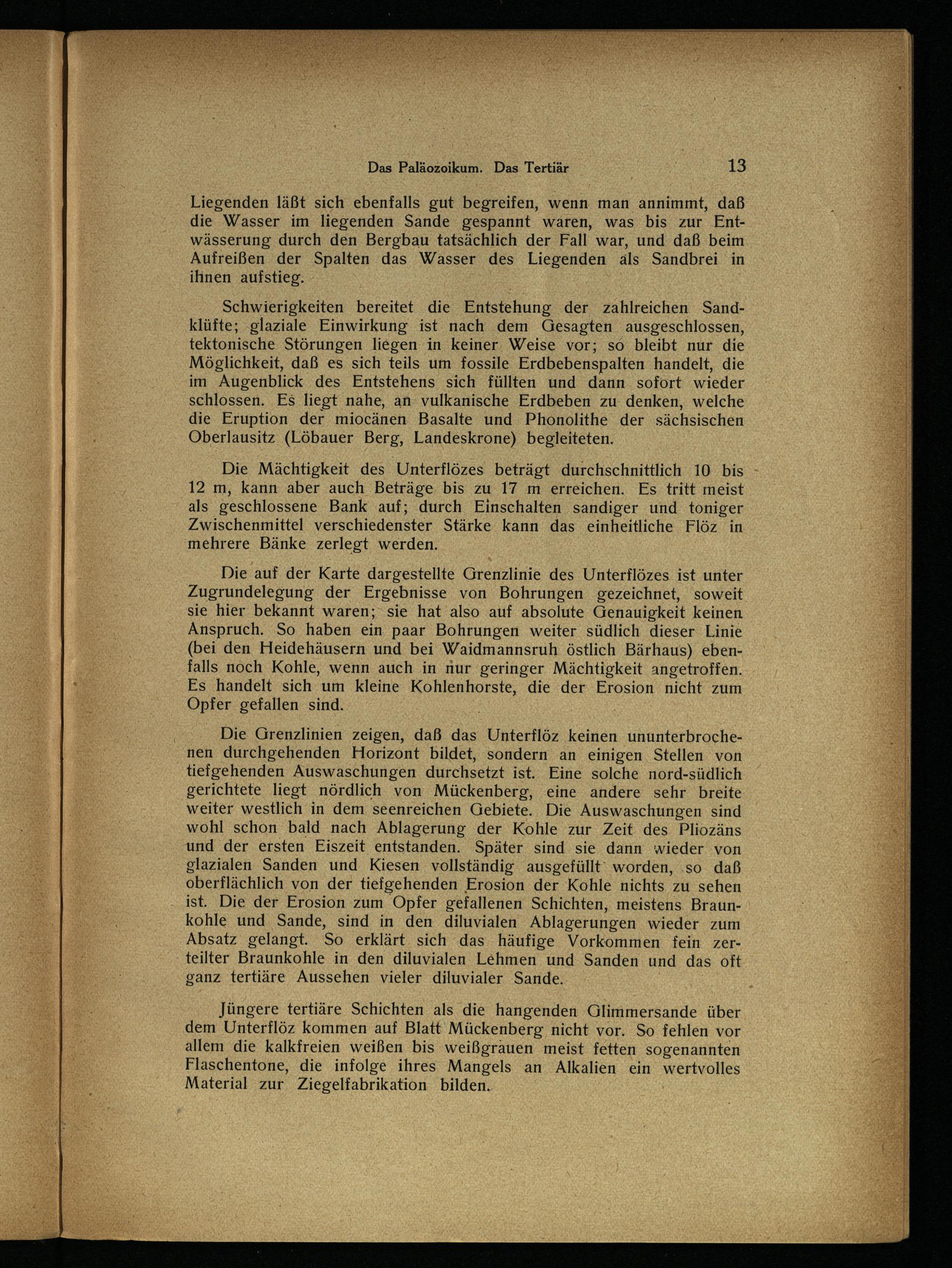 Schwierigkeiten bereitet die Entstehung der zahlreichen Sandklüfte; ‚glaziale Einwirkung ist nach dem Gesagten ausgeschlossen, tektonische Störungen liegen in keiner Weise vor; so bleibt nur die Möglichkeit, daß es sich teils um fossile Erdbebenspalten handelt, die im Augenblick des Entstehens sich füllten und dann. sofort wieder schlossen. Es liegt nahe, an vulkanische Erdbeben zu denken, welche die Eruption der miocänen Basalte und Phonolithe der sächsischen Oberlausitz (Löbauer Berg, Landeskrone) begleiteten.