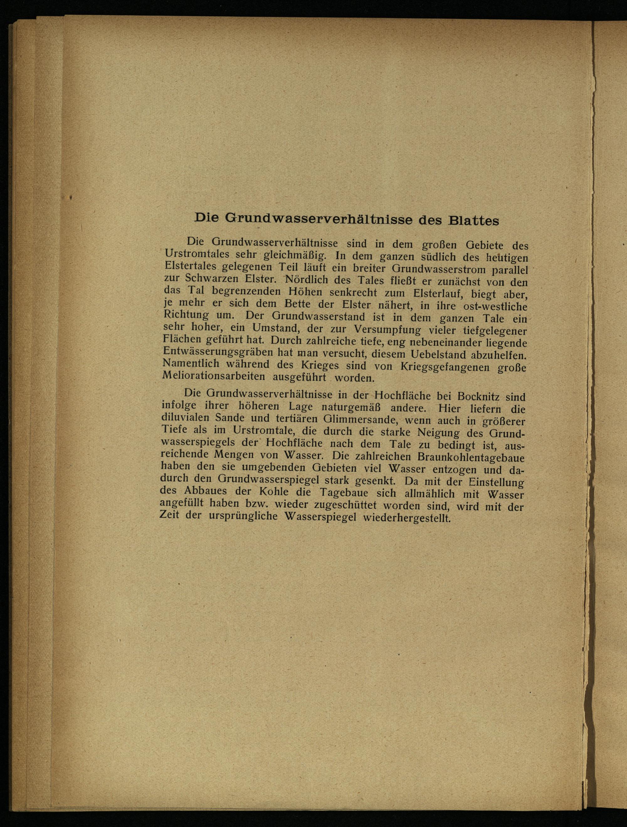 Die Grundwasserverhältnisse in der Hochfläche bei Bocknitz sind infolge ihrer höheren Lage naturgemäß andere. Hier liefern die diluvialen Sande und tertiären Glimmersande, wenn auch in größerer Tiefe als im Urstromtale, die durch die starke Neigung des Grundwasserspiegels der‘ Hochfläche nach dem Tale zu bedingt ist, ausreichende Mengen von Wasser... Die zahlreichen Braunkohlentagebaue haben den sie umgebenden Gebieten viel Wasser entzogen und dadurch den Grundwasserspiegel stark gesenkt. Da mit der Einstellung des Abbaues der Kohle die Tagebaue sich allmählich mit Wasser. angefüllt haben bzw. wieder zugeschüttet worden sind, wird mit der Zeit der ursprüngliche Wasserspiegel wiederhergestellt.