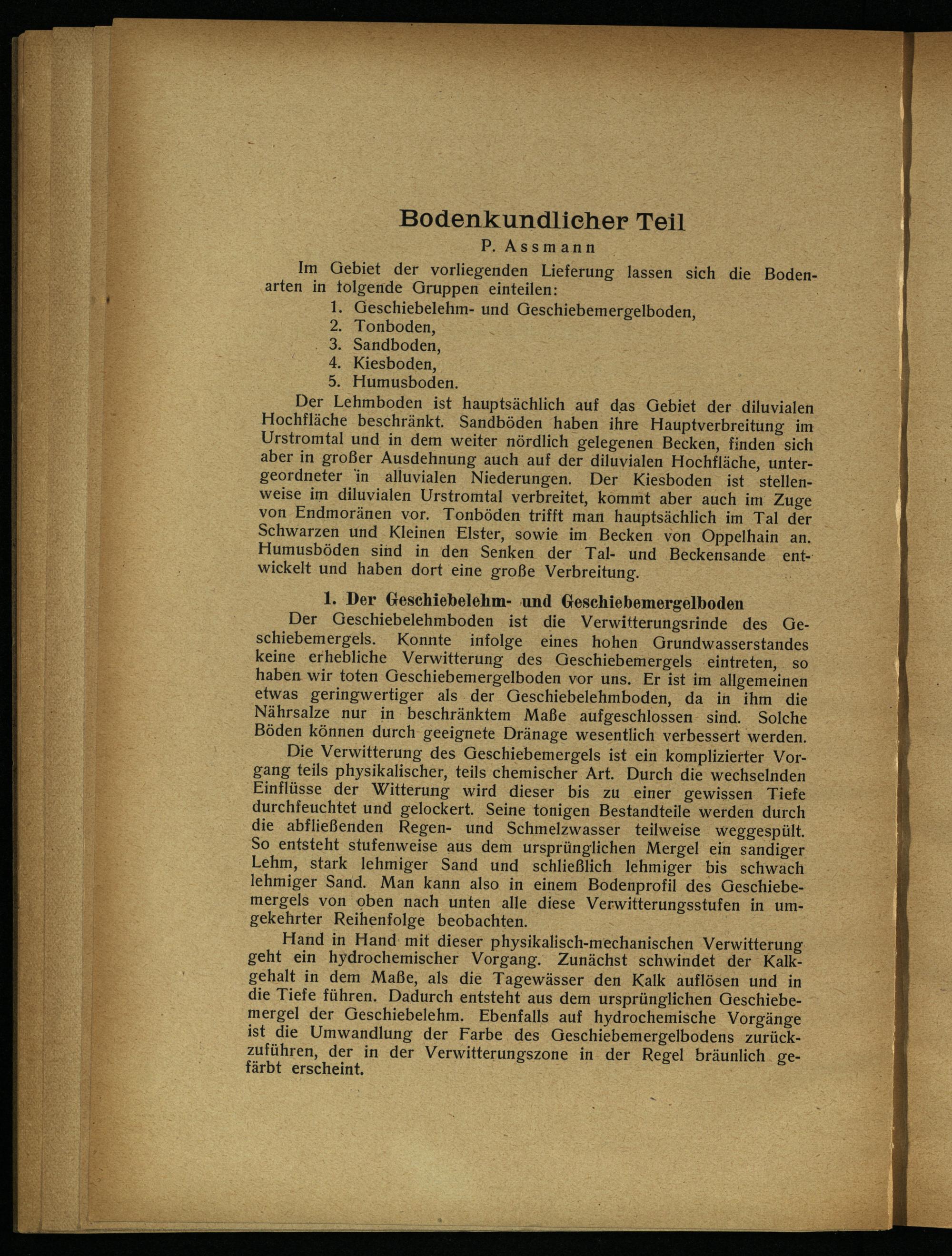 Im Gebiet der vorliegenden Lieferung lassen sich die Bodenarten in tolgende Gruppen einteilen:. 1. Geschiebelehm- und Geschiebemergelboden, 2. Tonboden,. 3. Sandboden, 4. Kiesboden, 5. Humusboden. s; Der Lehmboden ist hauptsächlich auf das Gebiet der. diluvialen Hochfläche beschränkt. Sandböden haben ihre Hauptverbreitung im Urstromtal und in dem weiter nördlich gelegenen Becken, finden sich aber in großer Ausdehnung auch auf der diluvialen Hochfläche, untergeordneter in alluvialen Niederungen. Der Kiesboden. ist stellenweise im diluvialen Urstromtal verbreitet, kommt aber auch im Zuge von Endmoränen vor. Tonböden trifft man hauptsächlich im Tal der Schwarzen und Kleinen Elster, sowie im. Becken von Oppclhain an. Humusböden sind in den Senken der Tal- und Beckensande entwickelt und haben dort eine große Verbreitung. S