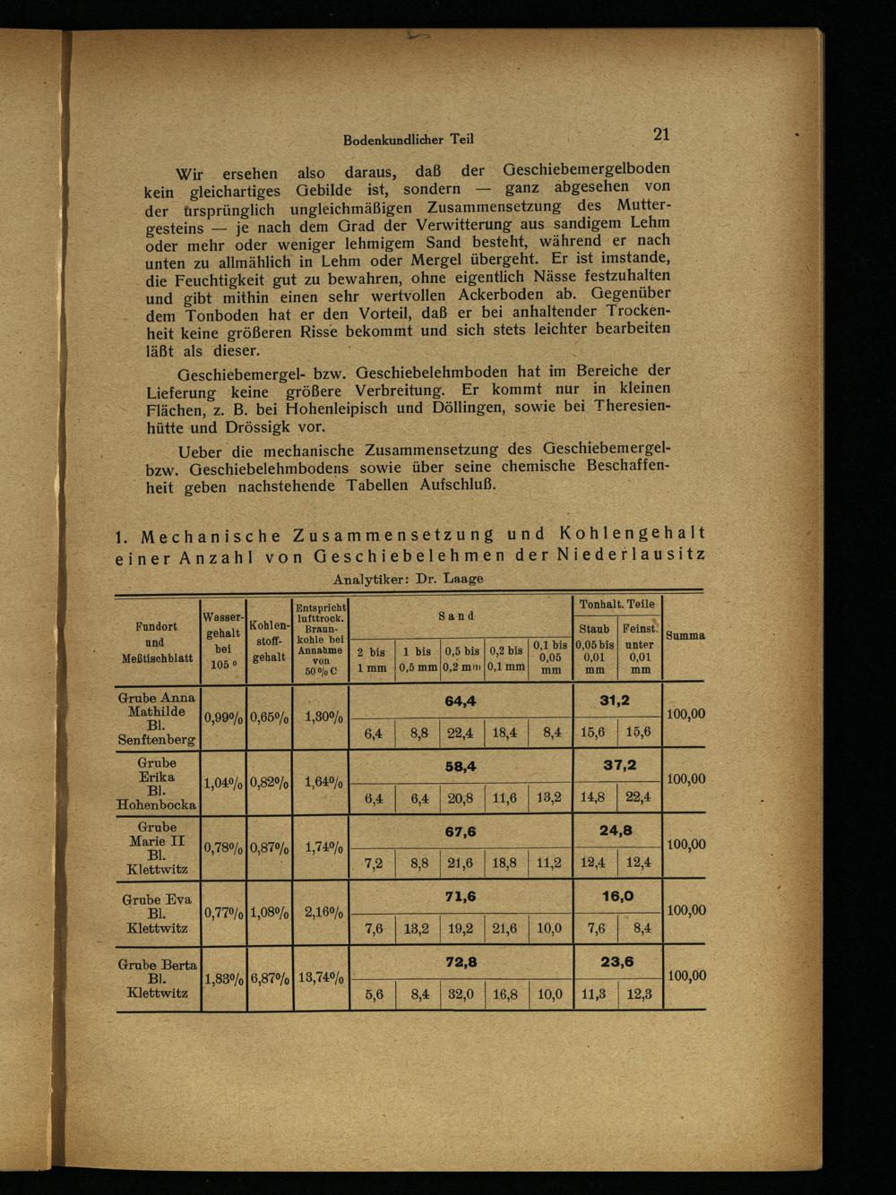 Ueber die mechanische Zusammensetzung des Geschiebemergelbzw. Geschiebelehmbodens sowie über seine chemische Beschaffenheit geben nachstehende Tabellen Aufschluß.
