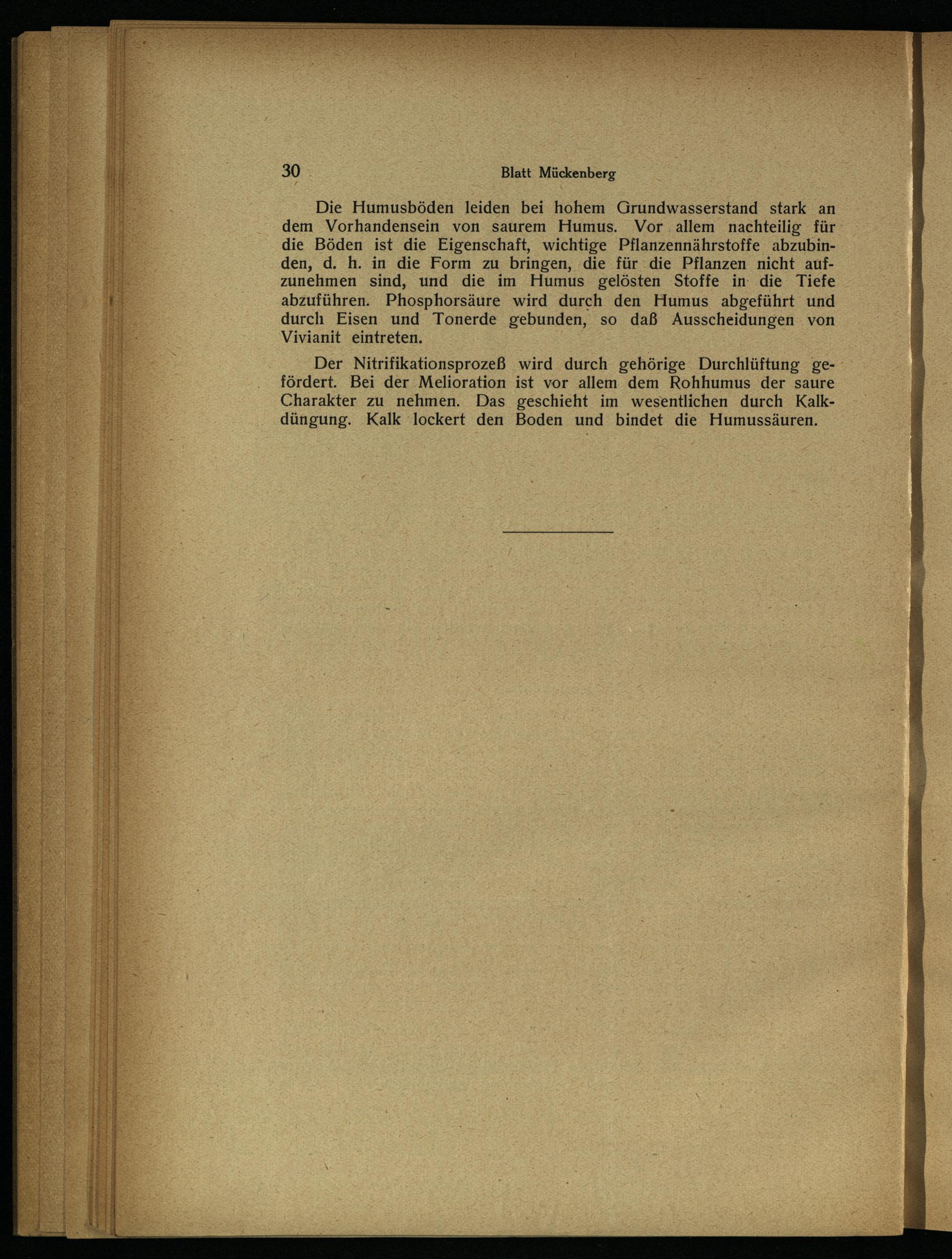 Die Humusböden leiden bei hohem Grundwasserstand stark an dem Vorhandensein von saurem Humus. Vor ‚allem nachteilig für‘ die Böden ist die Eigenschaft, wichtige Pflanzennährstoffe abzubinden, d. h. in die Form zu bringen, die für die Pflanzen nicht aufzunehmen sind, und die im Humus gelösten Stoffe in: die Tiefe abzuführen. Phosphorsäure wird durch den Humus abgeführt und durch Eisen und Tonerde gebunden, so daß Ausscheidungen von Vivianit eintreten. Zn