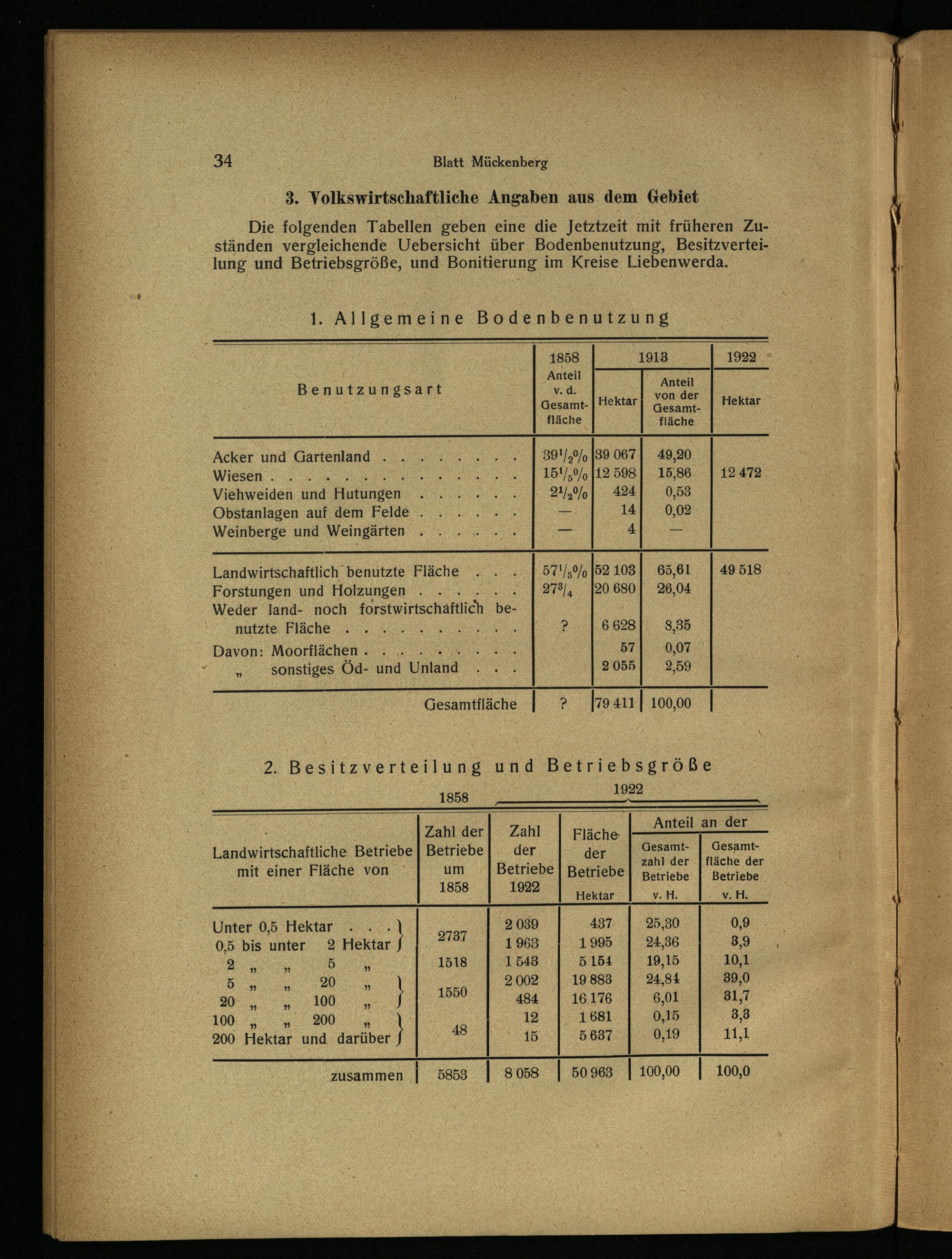 Die folgenden Tabellen geben eine die Jetztzeit mit früheren Zuständen vergleichende Uebersicht über Bodenbenutzung, Besitzverteilung und Betriebsgröße, und Bonitierung im Kreise Liebenwerda.