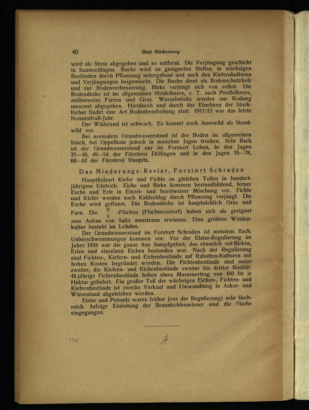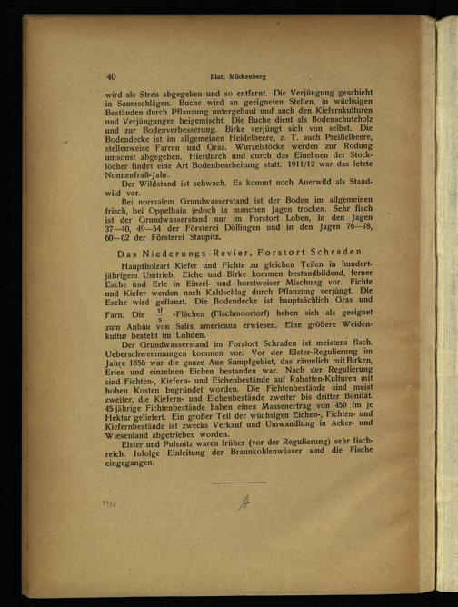 40 Blatt Mückenberg,; “ wird als Streu abgegeben und so entfernt. Die Verjüngung geschieht in Saumschlägen. Buche wird an geeigneten Stellen, in wüchsigen Beständen durch Pflanzung untergebaut und auch den Kiefernkulturen und Verjüngungen beigemischt. Die Buche dient als Bodenschutzholz und zur Bodenverbesserung. Birke verjüngt sich von selbst. Die Bodendecke ist im allgemeinen Heidelbeere, z. T. auch Preißelbeere, stellenweise Farren und Gras. Wurzelstöcke werden zur Rodung umsonst abgegeben. Hierdurch und durch das Einebnen der Stocklöcher findet eine Art Bodenbearbeitung statt. 1911/12 war das letzte‘ Nonnenfraß- Jahr.