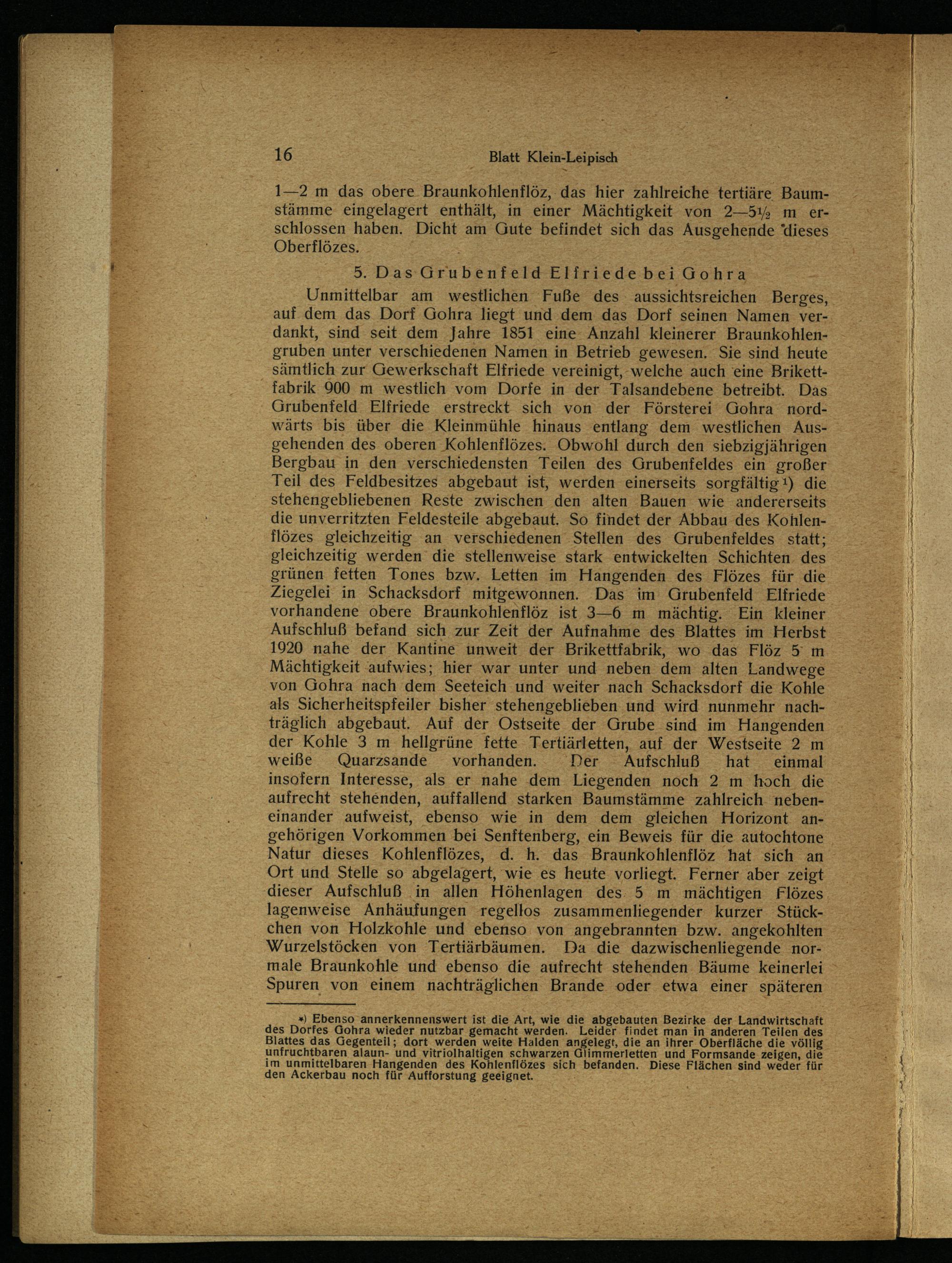 Unmittelbar am westlichen‘ Fuße des aussichtsreichen Berges, auf dem das Dorf Gohra liegt und dem das Dorf seinen Namen verdankt, sind seit dem Jahre 1851 eine Anzahl kleinerer Braunkohlengruben unter verschiedenen Namen in Betrieb gewesen. Sie sind heute sämtlich zur Gewerkschaft Elfriede vereinigt, welche auch eine Brikettfabrik 900 m westlich vom Dorfe in der Talsandebene betreibt. Das Grubenfeld. Elfriede erstreckt sich von der Försterei Gohra nordwärts bis über die Kleinmühle hinaus entlang dem westlichen Ausgehenden des oberen Kohlenflözes. Obwohl durch den siebzigjährigen Bergbau in den verschiedensten Teilen des Grubenfeldes ein großer Teil des Feldbesitzes abgebaut ist, werden einerseits sorgfältig!) die stehengebliebenen Reste zwischen den alten Bauen wie andererseits die unverritzten Feldesteile abgebaut. So findet der Abbau des Kohlenflözes gleichzeitig an verschiedenen Stellen des Grubenfeldes statt; gleichzeitig werden die stellenweise stark entwickelten Schichten. des grünen fetten Tones bzw. Letten im Hangenden des Flözes für die Ziegelei in Schacksdorf mitgewonnen. Das im Grubenfeld Elfriede vorhandene 6bere Braunkohlenflöz ist 3—6 m mächtig. Ein kleiner Aufschluß befand sich zur Zeit der Aufnahme des Blattes im Herbst 1920 nahe der Kantine unweit der Brikettfabrik, wo das Flöz 5 m Mächtigkeit aufwies; hier war unter und neben dem alten Landwege von Gohra nach dem Seeteich und weiter nach Schacksdorf die Kohle