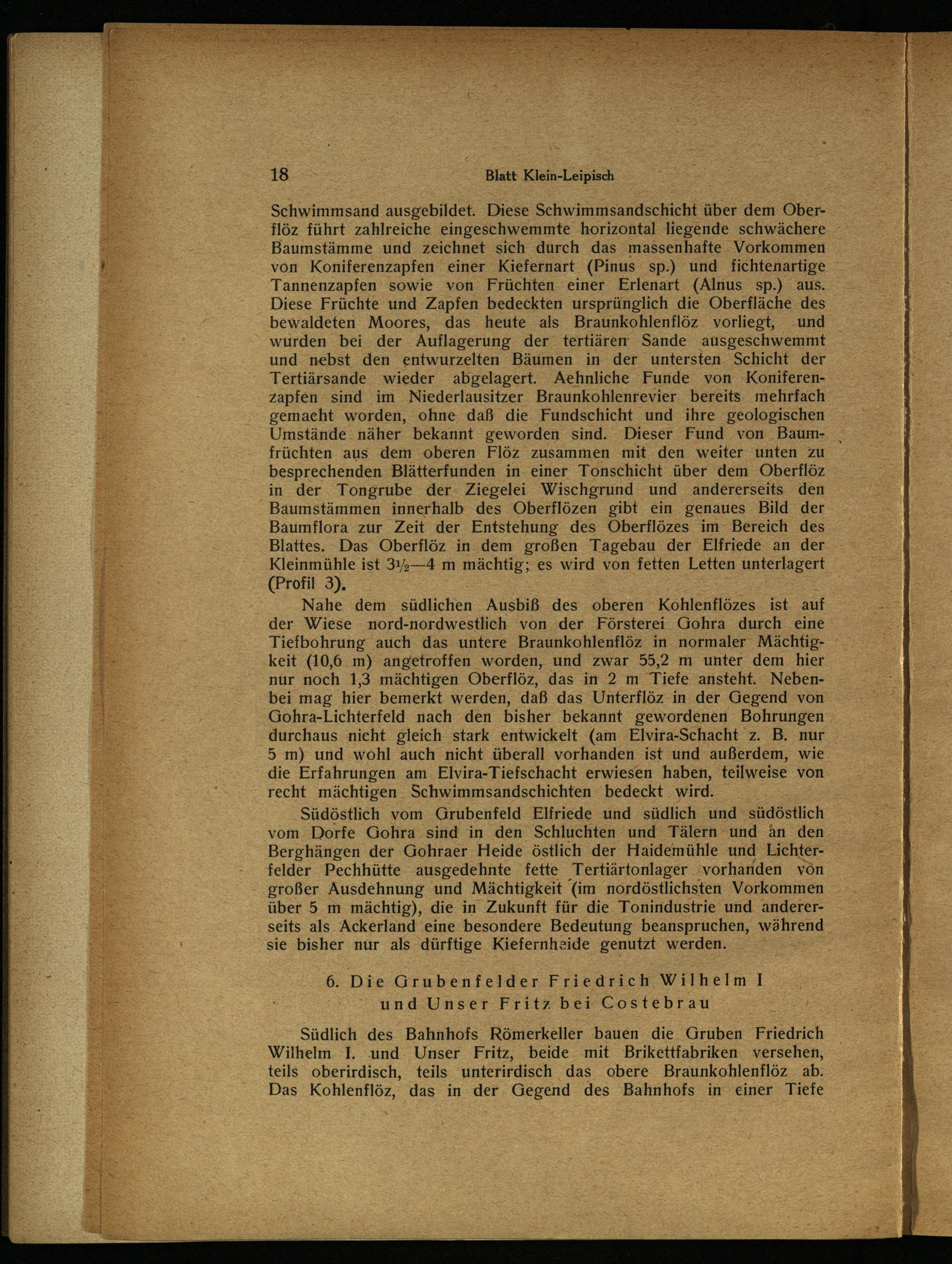 Nahe dem südlichen Ausbiß des oberen Kohlenflözes ist. auf der Wiese_ nord-nordwestlich von der. Försterei Gohra durch. eine Tiefbohrung‘ auch das untere Braunkohlenflöz in. normaler Mächtigkeit(10,6 m) angetroffen worden, und zwar 55,2 m unter dem hier nur noch 1,3 mächtigen Oberflöz, das in 2 m Tiefe ansteht. Nebenbei mag hier bemerkt werden, daß das Unterflöz in der Gegend von Gohra-Lichterfeld nach den bisher bekannt gewordenen Bohrungen‘ durchaus nicht gleich stark entwickelt(am Elvira-Schacht z. B. nur 5 m) und wohl auch nicht überall vorhanden ist und außerdem, wie die Erfahrungen am Elvira-Tiefschacht erwiesen haben, teilweise von recht mächtigen. Schwimmsandschichten bedeckt wird.