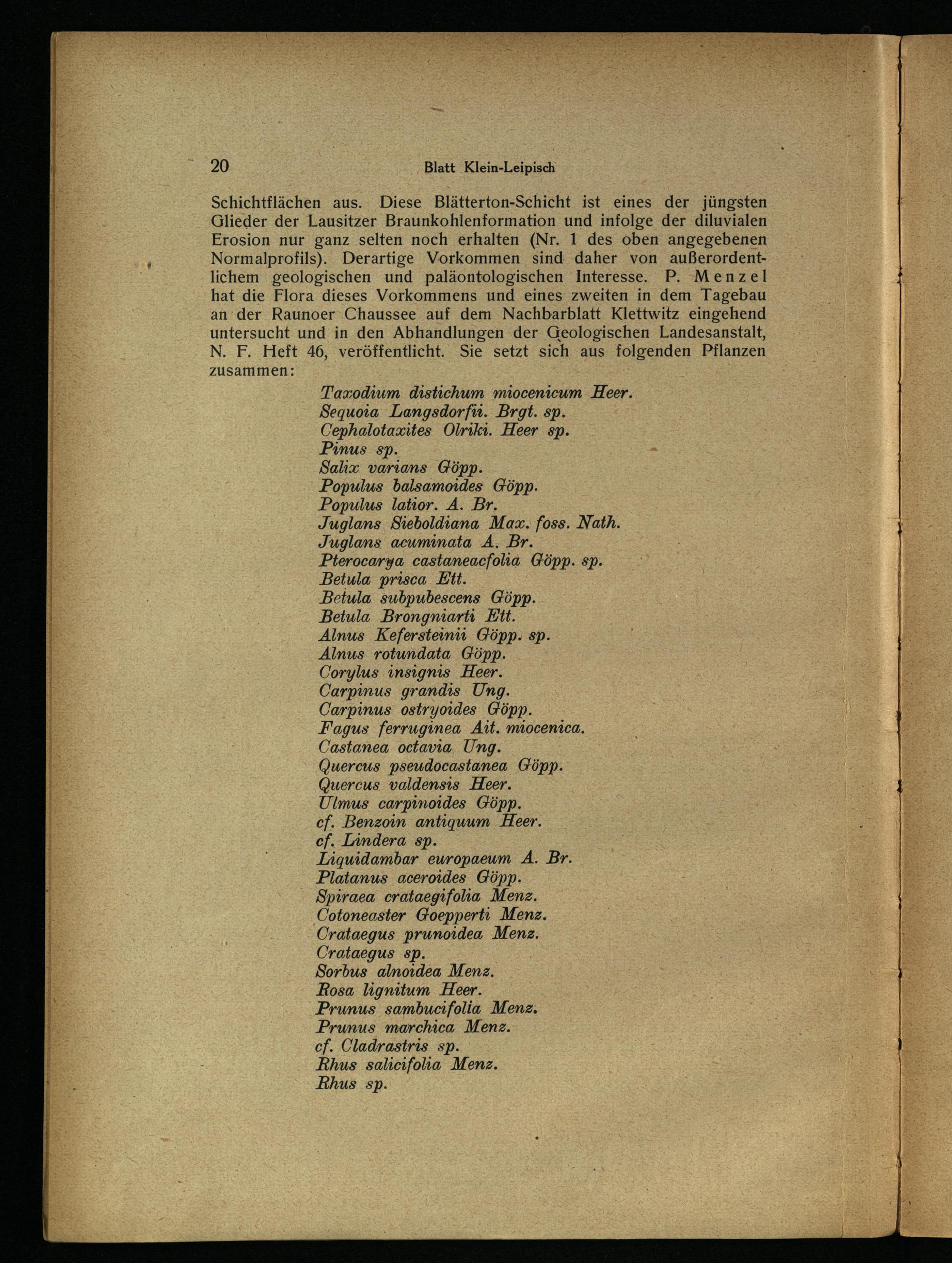Schichtflächen aus. Diese Blätterton-Schicht ist eines der jüngsten Glieder der Lausitzer Braunkohlenformation und infolge der diluvialen Erosion nur ganz selten noch erhalten(Nr. 1 des oben angegebenen Normalprofils). Derartige Vorkommen sind daher von außerordentlichem geologischen und paläontologischen Interesse, P. Menzel hat die Flora dieses Vorkommens und eines zweiten in dem Tagebau an’ der Raunoer Chaussee auf dem Nachbarblatt Klettwitz eingehend untersucht und in den Abhandlungen der Geologischen Landesanstalt, N. F. Heft 46, veröffentlicht. Sie setzt sich aus folgenden Pflanzen zusammen: