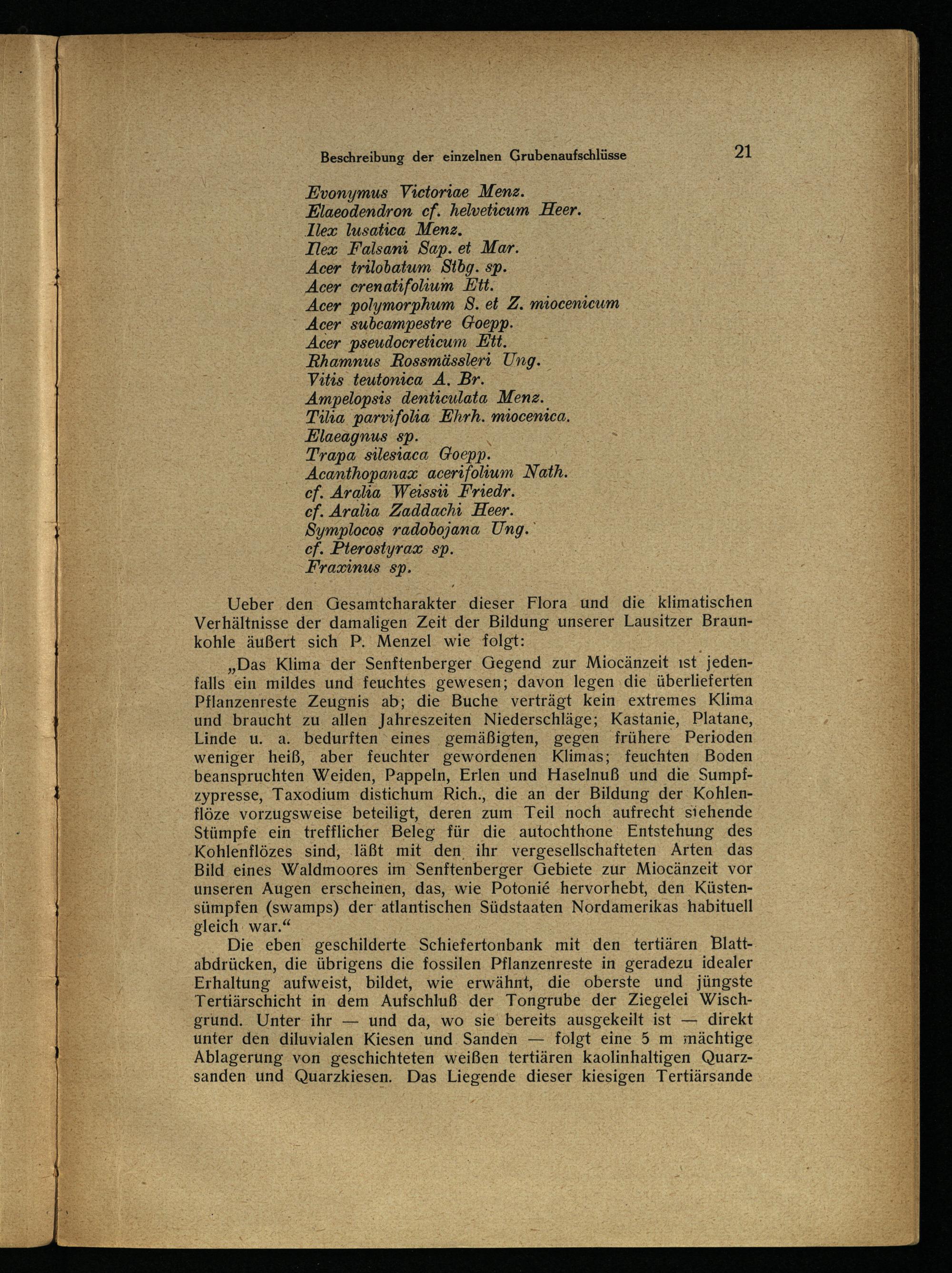 „Das Klima der Senftenberger Gegend zur Miocänzeit ist‘ jedenfalls: ein mildes und feuchtes gewesen; davon legen ‚die überlieferten Pflanzenreste Zeugnis ab; die Buche verträgt kein extremes Klima und braucht zu. allen Jahreszeiten Niederschläge; Kastanie, Platane, Linde u. a. bedurften eines gemäßigten, gegen frühere Perioden weniger heiß, aber feuchter gewordenen Klimas; feuchten Boden beanspruchten Weiden, Pappeln, Erlen und Haselnuß und die Sumpfzypresse, Taxodium distichum Rich., die.an der Bildung der Kohlenflöze vorzugsweise beteiligt, deren zum Teil noch aufrecht siehende Stümpfe ein trefflicher Beleg für die autochthone Entstehung des Kohlenflözes sind, läßt mit den ihr vergesellschafteten Arten das Bild eines Waldmoores im Senftenberger Gebiete zur Miocänzeit vor unseren Augen erscheinen, das, wie Potonie hervorhebt, den Küstensümpfen(swamps) der‘ atlantischen Südstaaten Nordamerikas habituell gleich. war.“