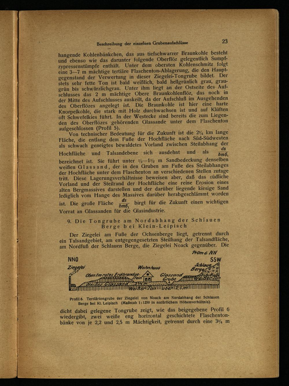 dicht dabei gelegene Tongrube zeigt, wie das beigegebene Profil 6 wiedergibt, zwei weiße eng horizontal geschichtete Flaschentonbänke von je 2,2 und 2,5 m Mächtigkeit, getrennt durch eine 3% m