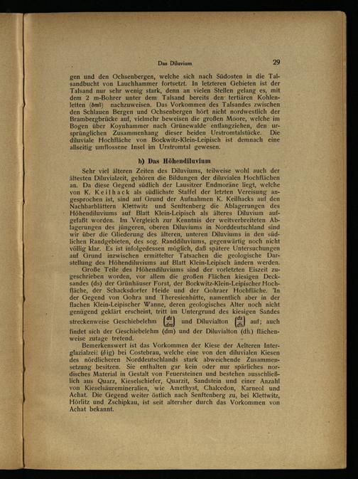 Große Teile des Höhendiluviums sind der vorletzten Eiszeit zugeschrieben worden, vor. allem die großen Flächen kiesigen Decksandes(ds) der Grünhäuser Forst, der Bockwitz-Klein-Leipischer Hochfläche, der Schacksdorfer Heide und der Gohraer Hochfläche.‘In der Gegend von Gohra und Theresienhütte, namentlich aber in der flachen Klein-Leipischer Wanne, deren geologisches Alter noch nicht genügend geklärt erscheint, tritt im Untergrund des kiesigen Sandes