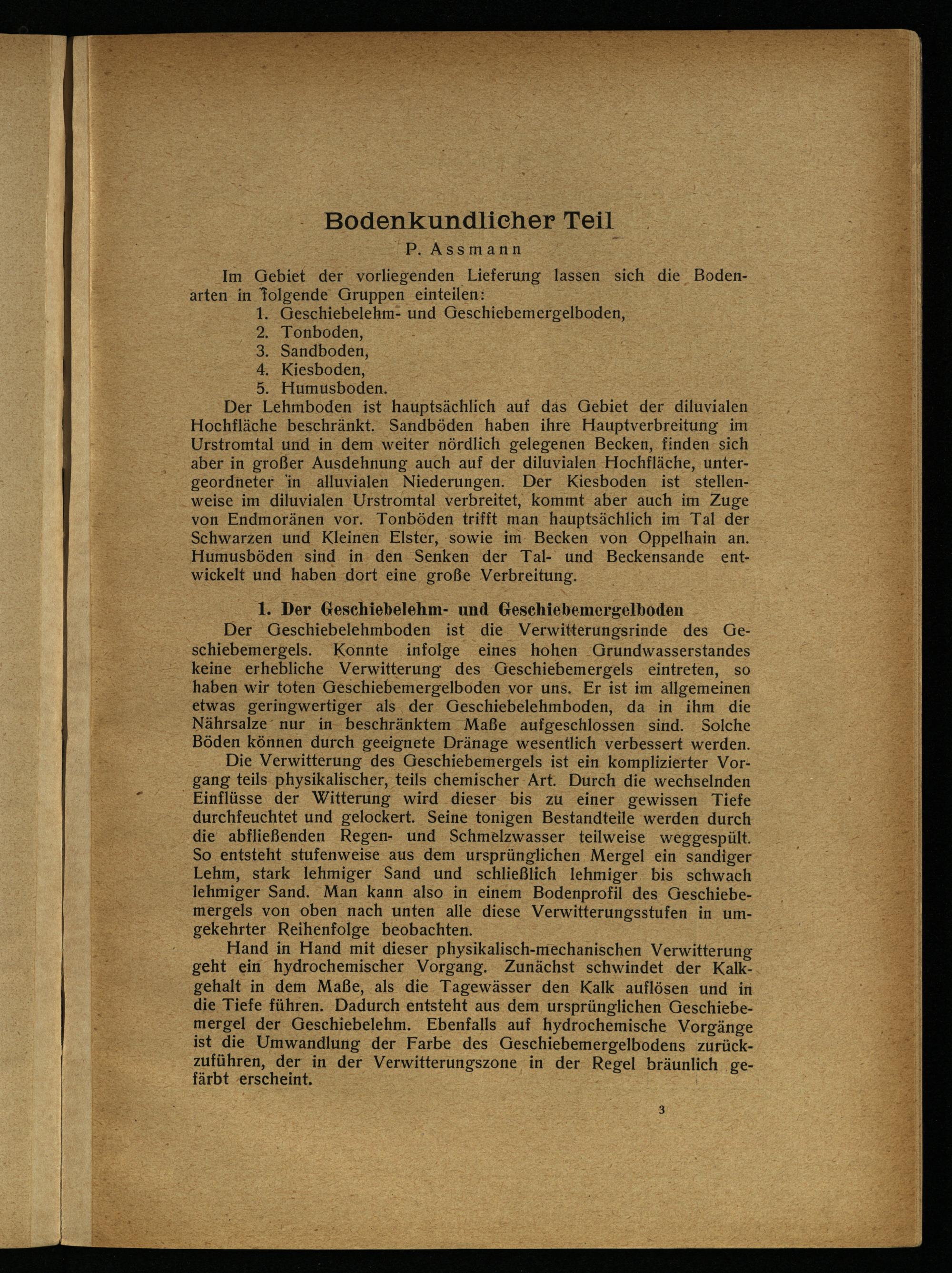 Der Lehmboden ist hauptsächlich auf das Gebiet der diluvialen Hochfläche beschränkt. Sandböden haben. ihre Hauptverbreitung im Urstromtal und in dem ‚weiter nördlich gelegenen Becken, finden sich aber in großer Ausdehnung auch auf der diluvialen Hochfläche, untergeordneter in alluvialen Niederungen. Der Kiesboden ist stellenweise im diluvialen Urstromtal verbreitet, kommt aber auch im Zuge von Endmoränen vor. Tonböden trifft man hauptsächlich im Tal der Schwarzen und Kleinen Elster, sowie im Becken von Oppelhain an. Humusböden sind in den Senken der Tal- und Beckensande entwickelt und haben dort eine große Verbreitung.