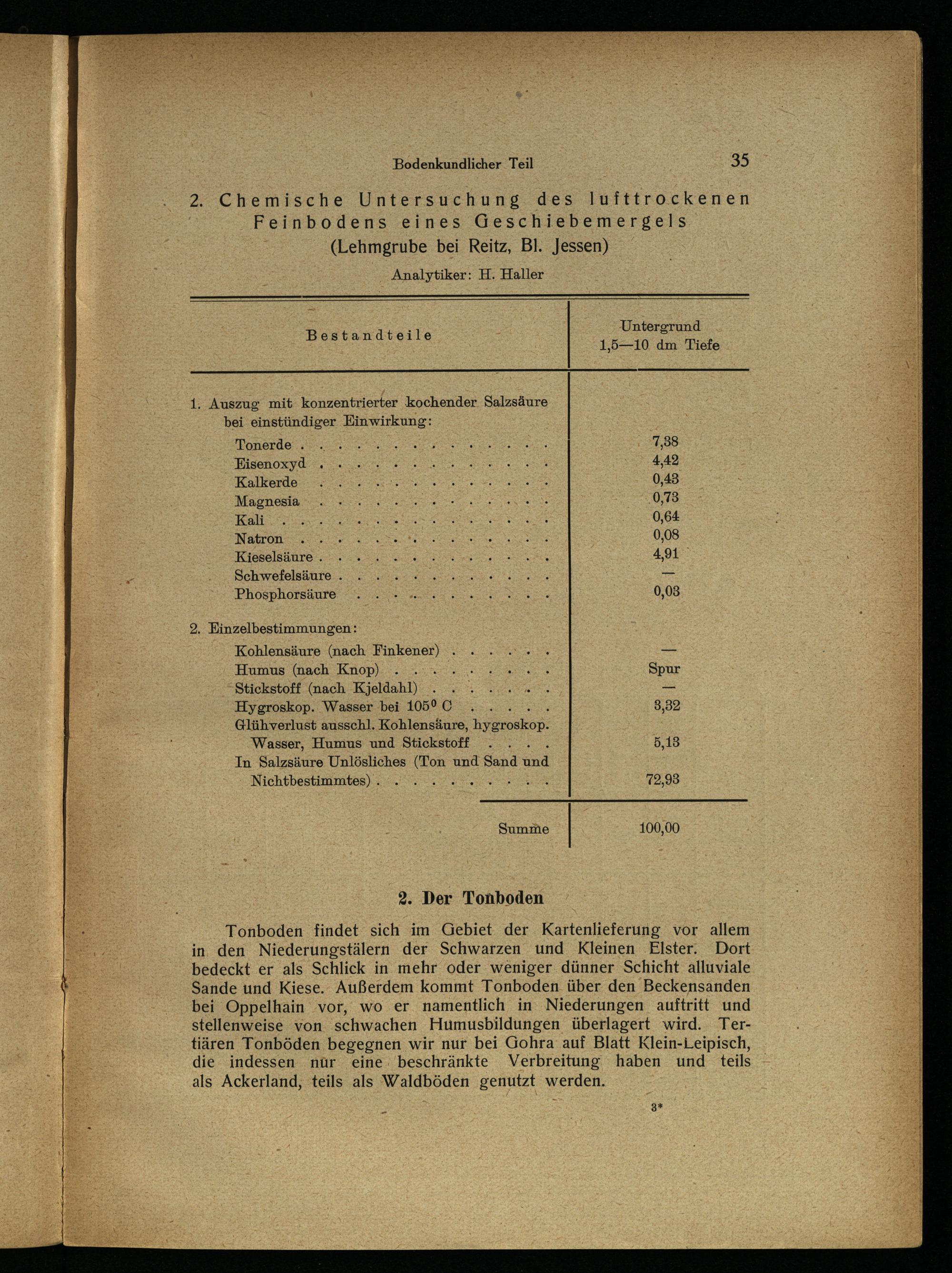2. Chemische Untersuchung des lufttrockenen Feinbodens eines Geschiebemergels (Lehmgrube bei Reitz, Bl. Jessen)