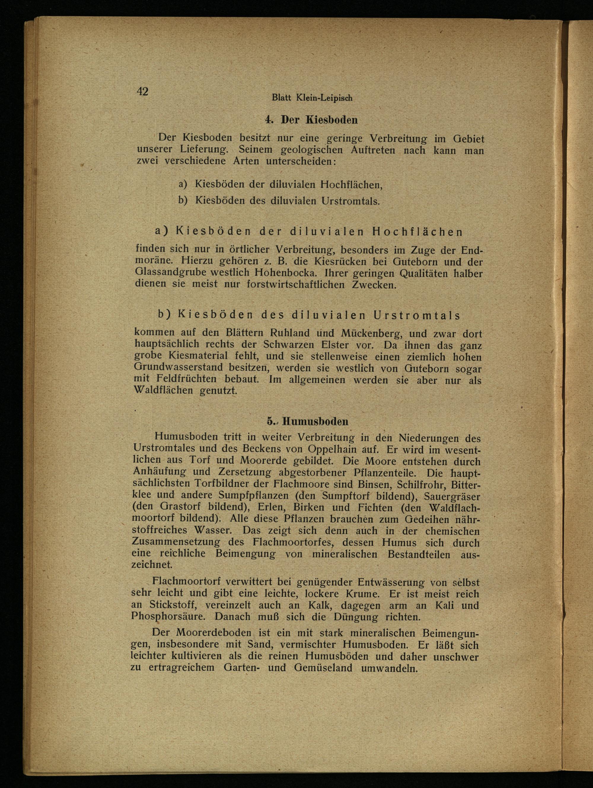 Humusboden tritt in weiter Verbreitung in den Niederungen des Urstromtales und des Beckens von Oppelhain auf. Er wird im wesentlichen. aus Torf und Moorerde gebildet. Die Moore entstehen durch Anhäufung und Zersetzung abgestorbener Pflanzenteile. Die hauptsächlichsten Torfbildner der Flachmoore sind Binsen, Schilfrohr, Bitterklee und andere Sumpfpflanzen(den Sumpftorf bildend), Sauergräser (den Grastorf bildend), Erlen, Birken und ‚Fichten(den Waldilachmoortorf bildend). Alle diese Pflanzen brauchen zum Gedeihen nähr