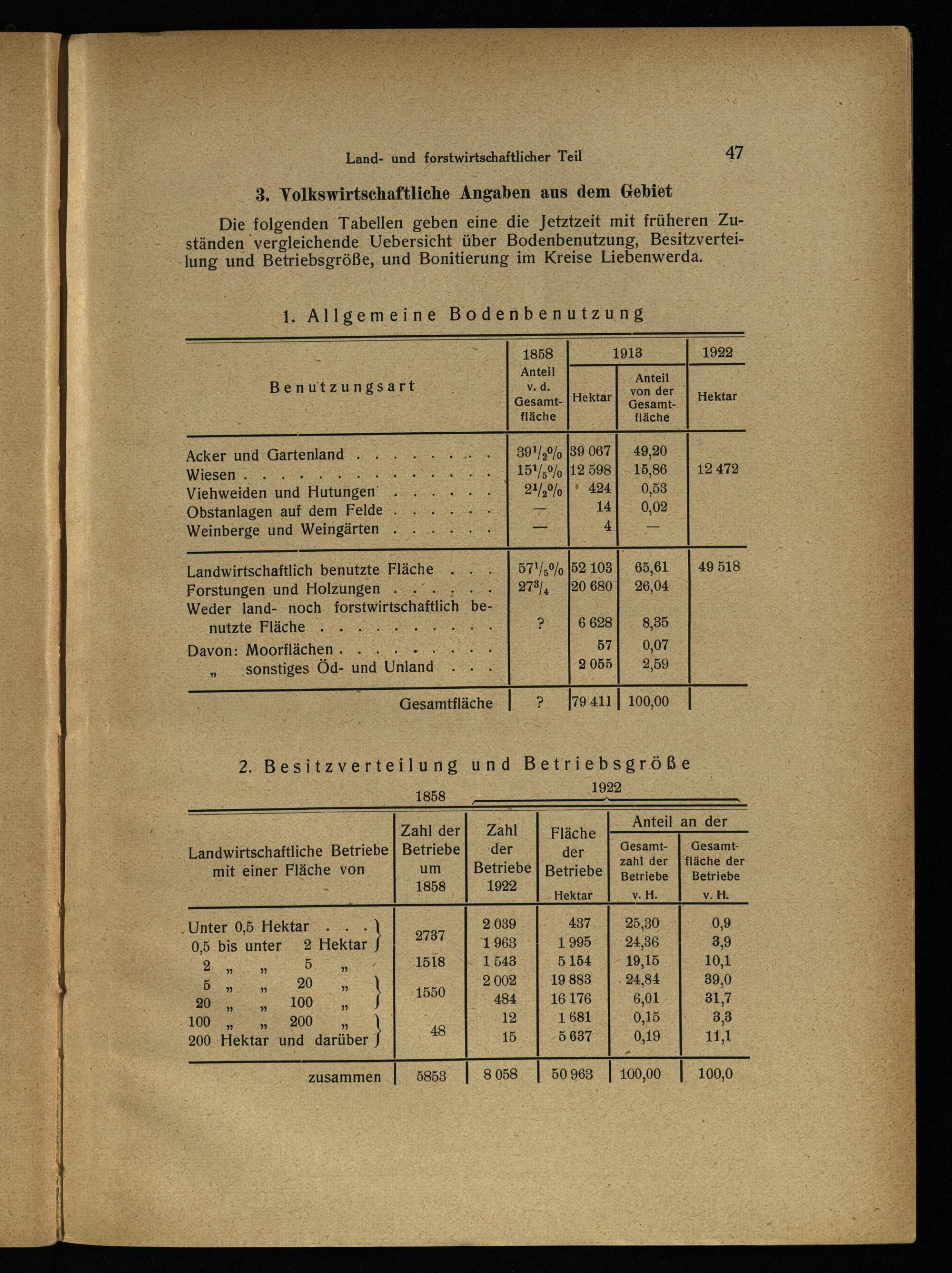Die folgenden Tabellen geben eine die Jetztzeit mit früheren Zuständen vergleichende Uebersicht über Bodenbenutzung, Besitzverteilung und Betriebsgröße, und Bonitierung im Kreise Liebenwerda.