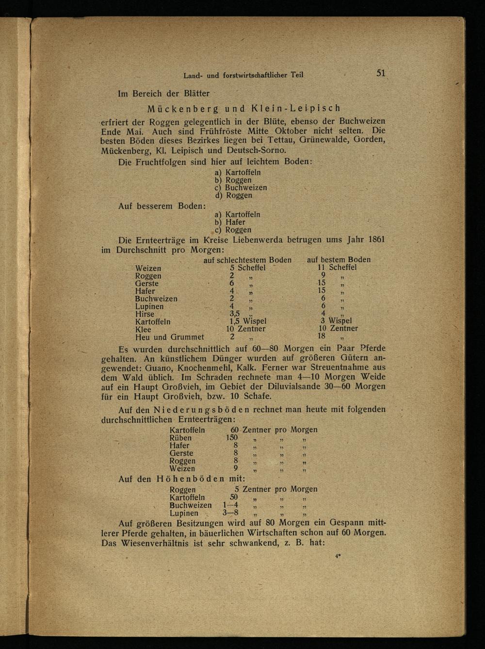 Die Ernteerträge im Kreise Liebenwerda betrugen ums Jahr 1861 im Durchschnitt pro Morgen:
