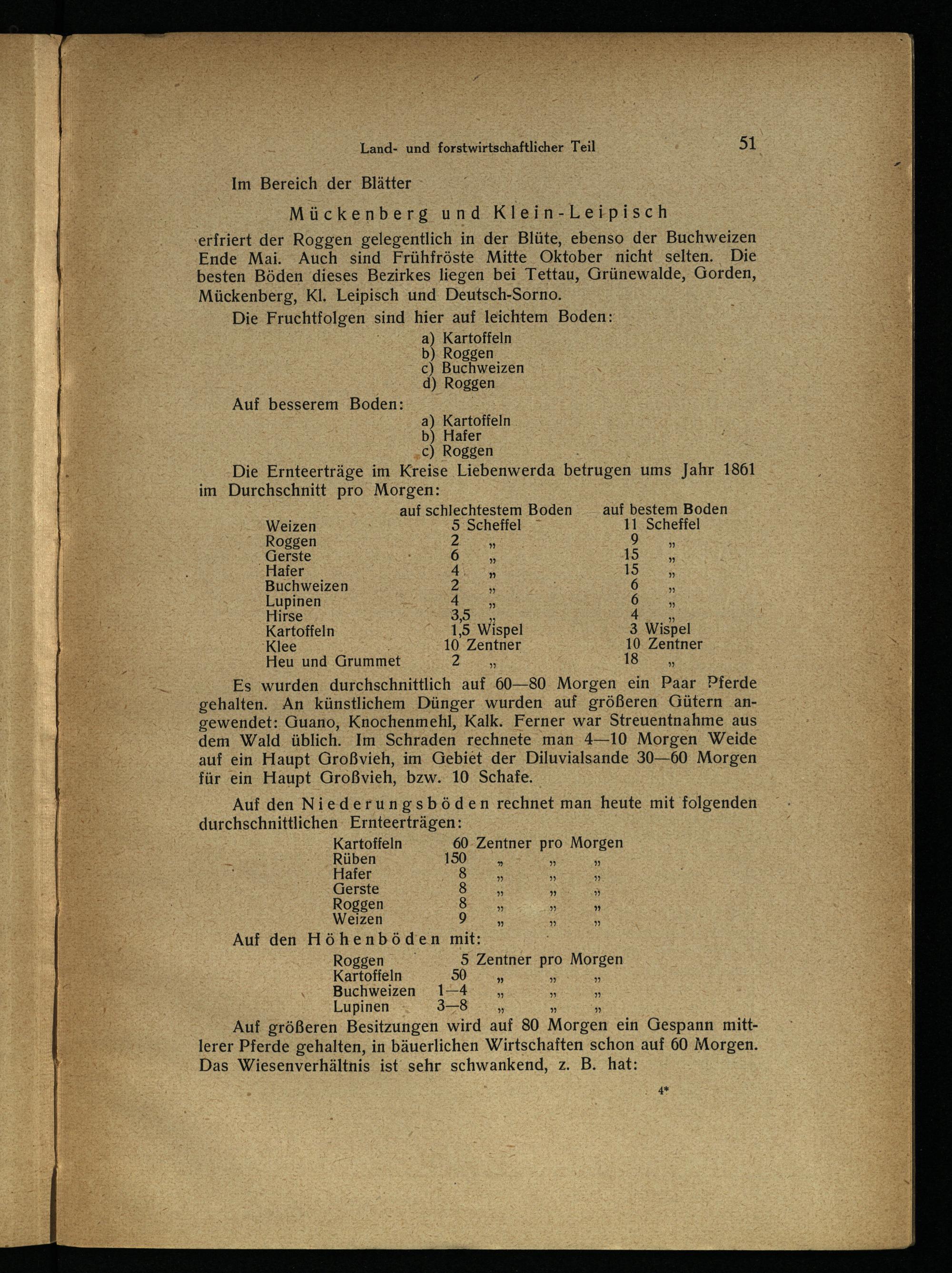 Kartoffeln 60-Zentner pro Morgen © Rüben 150* A Hafer 8”-„ Gerste 8 Ce% 5 Roggen 8””” Weizen 9 Ze 5 5 Auf den Höhenböden mit:; Roggen 5 Zentner pro Morgen Kartoffeln 50>® x Buchweizen 1—4 7 Lupinen 3—8 x%