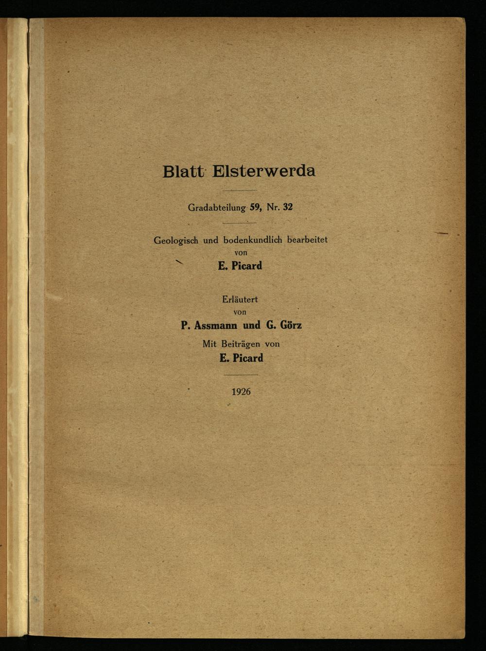 Blatt: Elsterwerda Gradabteilung 59, Nr. 32 Geologisch und bodenkundlich bearbeitet von >: E, Picard Erläutert; N: 7 von;; En P. Assmann und G. Görz CA Mit Beiträgen von E. Picard 1926
