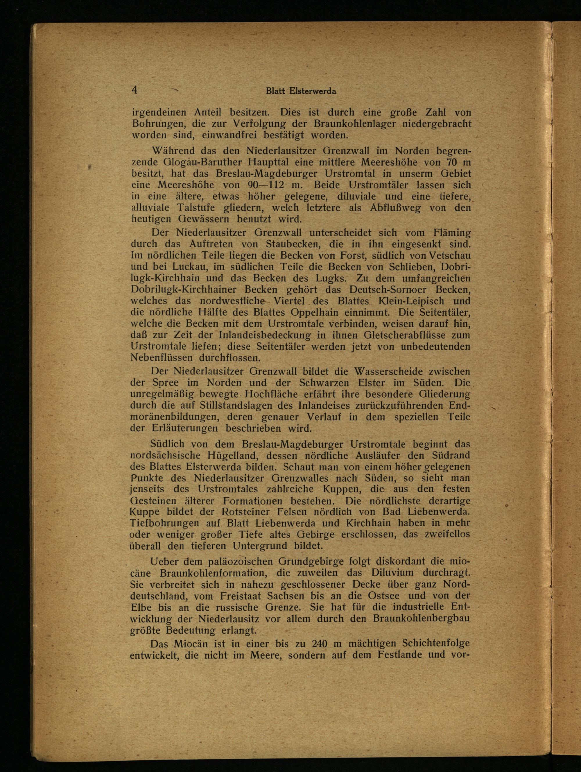 Südlich von dem Breslau -Magdeburger Urstromtale beginnt das nordsächsische Hügelland, dessen nördliche Ausläufer den Südrand des Blattes Elsterwerda bilden. Schaut man von einem höher gelegenen Punkte ‚des Niederlausitzer Grenzwalles nach Süden, so sieht man jenseits des Urstromtales zahlreiche Kuppen, die: aus den festen Gesteinen‘älterer Formationen bestehen. Die nördlichste derartige Kuppe bildet der Rotsteiner Felsen nördlich von Bad Liebenwerda . Tiefbohrungen auf. Blatt Liebenwerda und Kirchhain haben in mehr oder weniger: großer Tiefe altes Gebirge erschlossen, das zweifellos überall den tieferen Untergrund bildet.