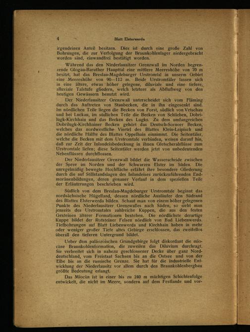 Ueber dem paläozoischen Grundgebirge folgt diskordant die miocäne Braunkohlenformation, die zuweilen das Diluvium durchragt. Sie. verbreitet sich in nahezu geschlossener Decke über ganz Norddeutschland, vom Freistaat Sachsen bis an die Ostsee und von der Elbe bis an die russische Grenze. Sie hat für die industrielle Ent- wicklung der Niederlausitz vor allem‘ durch den Braunkohlenbergbau größte Bedeutung erlangt.