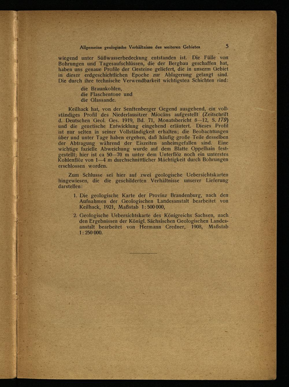 Keilhack hat, von der Senftenberger Gegend ausgehend, ein: vollständiges. Profil des Niederlausitzer . Miocäns aufgestellt(Zeitschrift d.-Deutschen Geol. Ges. 1919, Bd. 71, Monatsbericht 8—12, S. 779) und die genetische Entwicklung eingehend ‚erläutert. Dieses Profil ist nur selten in seiner- Vollständigkeit erhalten; die Beobachtungen über und unter Tage haben ergeben, daß häufig große. Teile desselben der Abtragung während ‚der Eiszeiten anheimgefallen sind. Eine wichtige fazielle Abweichung wurde auf dem. Blatte Oppelhain festgestellt; hier ist ca 50—70 m unter dem Unterflöz noch ein unterstes Kohlenflöz von 1—4 m durchschnittlicher Mächtigkeit durch Bohrungen erschlossen worden.