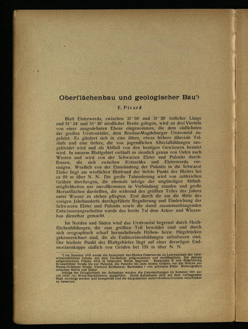 _*) Im Sommer 1910 wurde ein Ausschnitt des Blattes Elsterwerda zu Lehrzwecken der landwirtschaftlichen Schule mit dem 2m-Bohrer aufgenommen und veröffentlicht. Die damals aufgenommene Fläche wird in folgender Weise begrenzt: Buchstabe B von Elsterwerda , Krauschützer Straße bis zur Pulsnitz , die Pulsnitz bis zum letzten Graben vor der Brücke der Plessa -Grödener Straße, Vorwerk Reißdamm, Buchstabe r von schwarze Elster Binnengraben zwischen. Kahla und Elster.