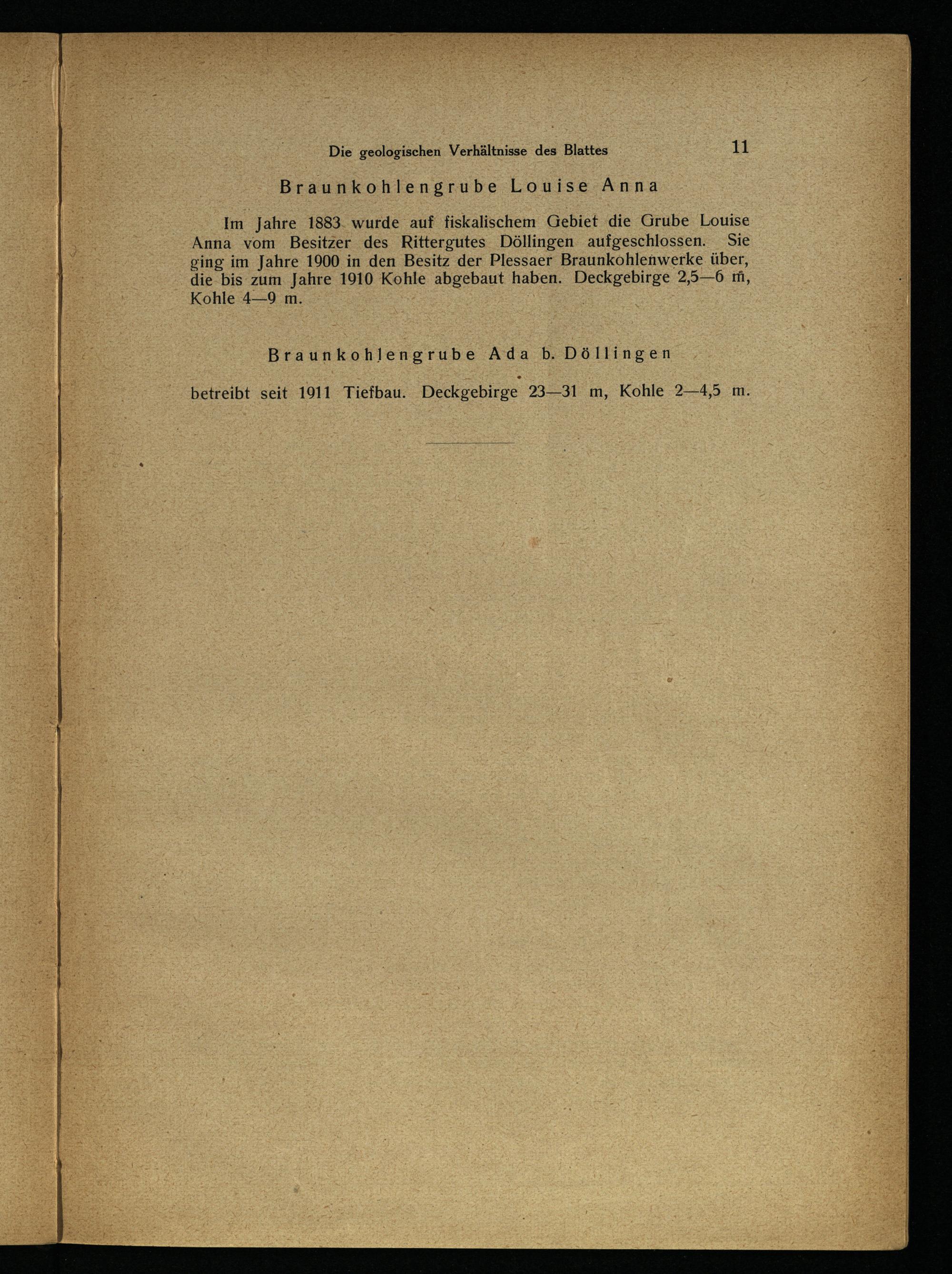 Anna vom Besitzer des Rittergutes Döllingen aufgeschlossen. Sie ging im Jahre 1900 in den Besitz der Plessaer Braunkohlenwerke über, die-bis zum Jahre 1910 Kohle abgebaut haben. Deckgebirge 2,5—6 m,