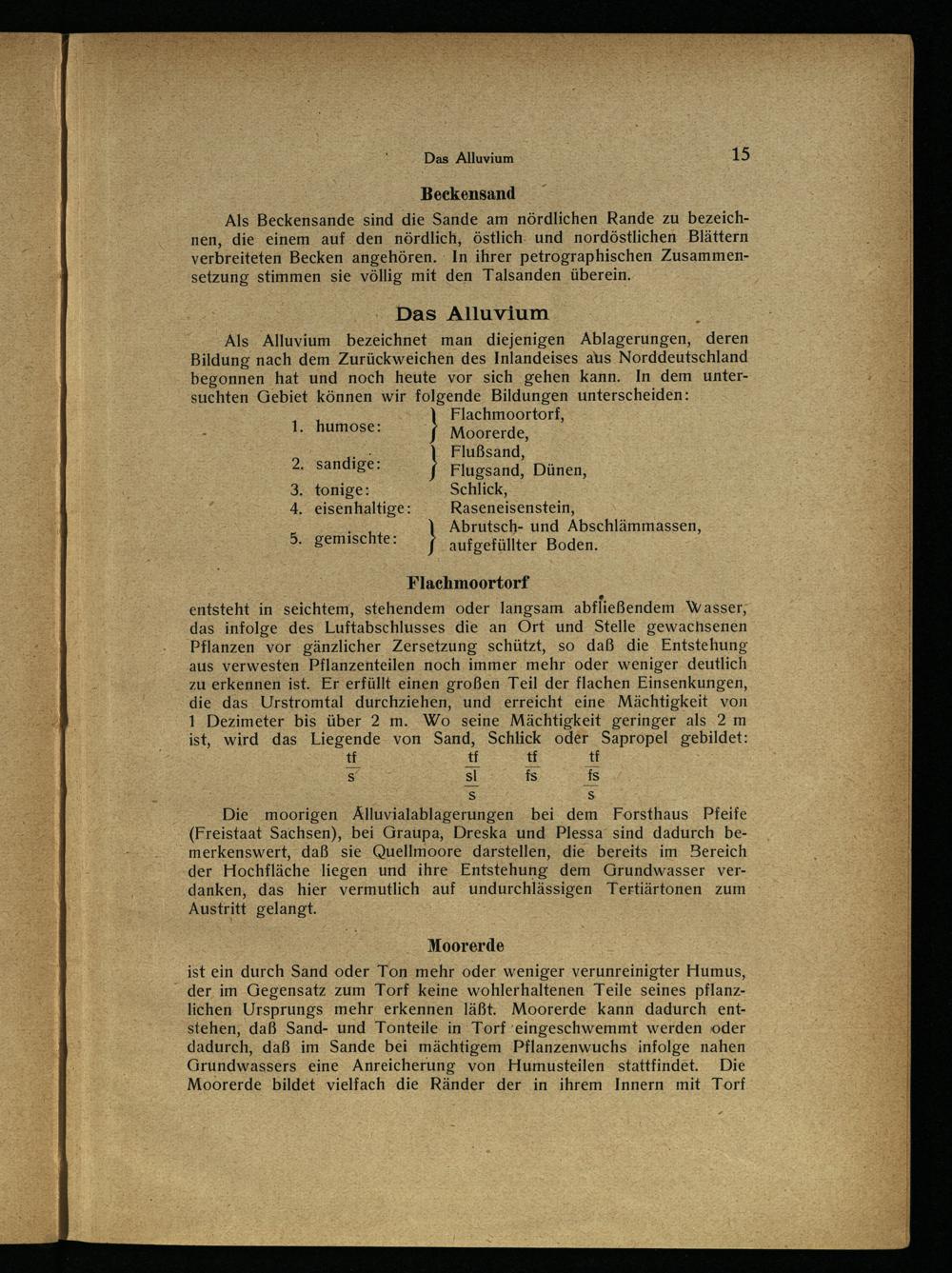 Ss Ss Die moorigen Älluvialablagerungen bei dem Forsthaus Pfeife (Freistaat Sachsen ), bei Graupa , Dreska und Plessa ‘ sind dadurch bemerkenswert, daß sie Quellmoore darstellen, die bereits im Bereich der Hochfläche liegen und ihre Entstehung dem Grundwasser verdanken, das hier vermutlich auf undurchlässigen Tertiärtonen zum