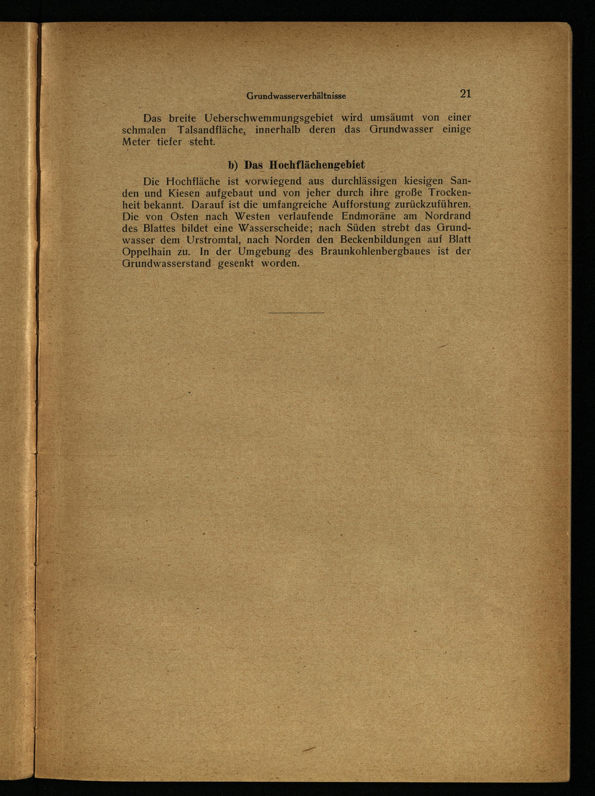 Die Hochfläche ist vorwiegend aus durchlässigen kiesigen San-. den und Kiesen aufgebaut und von jeher durch ihre große Trockenheit bekannt. Darauf ist die umfangreiche Aufforstung zurückzuführen. Die von Osten nach Westen verlaufende Endmoräne am Nordrand des Blattes bildet eine Wasserscheide; nach Süden strebt das Grundwasser dem Urstromtal, nach Norden: den Beckenbildungen auf Blatt Oppelhain zu. In der Umgebung des Brauhkohlenbergbanes ist der Grundwasserstand. gesenkt worden.