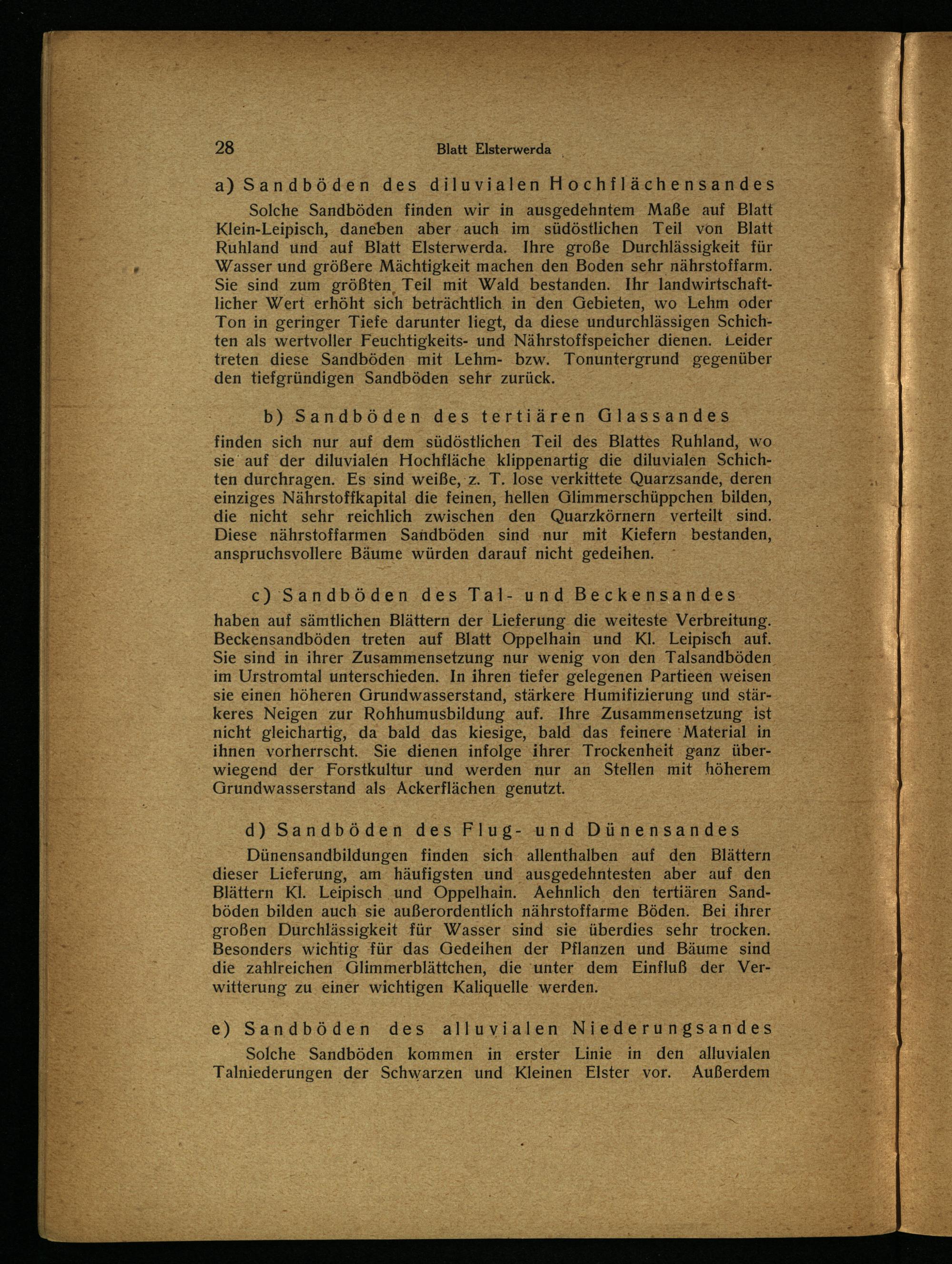 Solche Sandböden finden wir in ausgedehntem Maße auf Blatt Klein-Leipisch, daneben aber auch im südöstlichen Teil von Blatt Ruhland und auf Blatt Elsterwerda . Ihre große Durchlässigkeit für Wasser und größere Mächtigkeit machen den Boden sehr nährstoffarm. Sie sind zum größten, Teil mit Wald bestanden. Ihr landwirtschaftlicher Wert erhöht sich beträchtlich in den Gebieten, wo Lehm oder Ton in geringer Tiefe darunter liegt, da diese undurchlässigen Schichten als wertvoller. Feuchtigkeits- und Nährstoffspeicher dienen. Leider treten. diese Sandböden. mit Lehm- bzw. Tonuntergrund gegenüber den tiefgründigen Sandböden sehr zurück.;