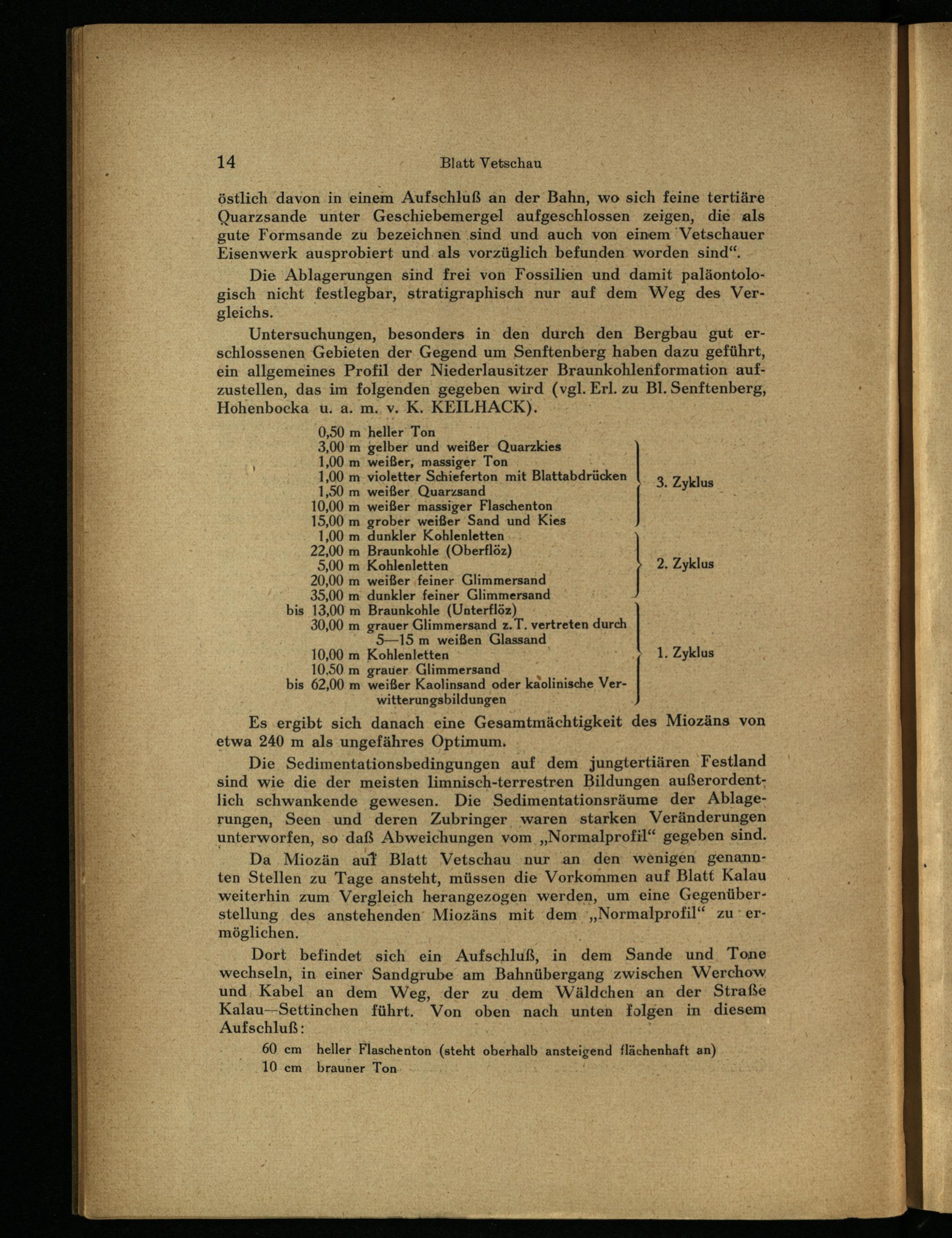 Da Miozän auf Blatt Vetschau nur an den wenigen genannten Stellen zu Tage ansteht, müssen die Vorkommen auf Blatt Kalau weiterhin zum Vergleich herangezogen werden, um eine Gegenüberstellung des anstehenden‘ Miozäns mit dem‘„Normalprofil“ zu‘ ermöglichen.;