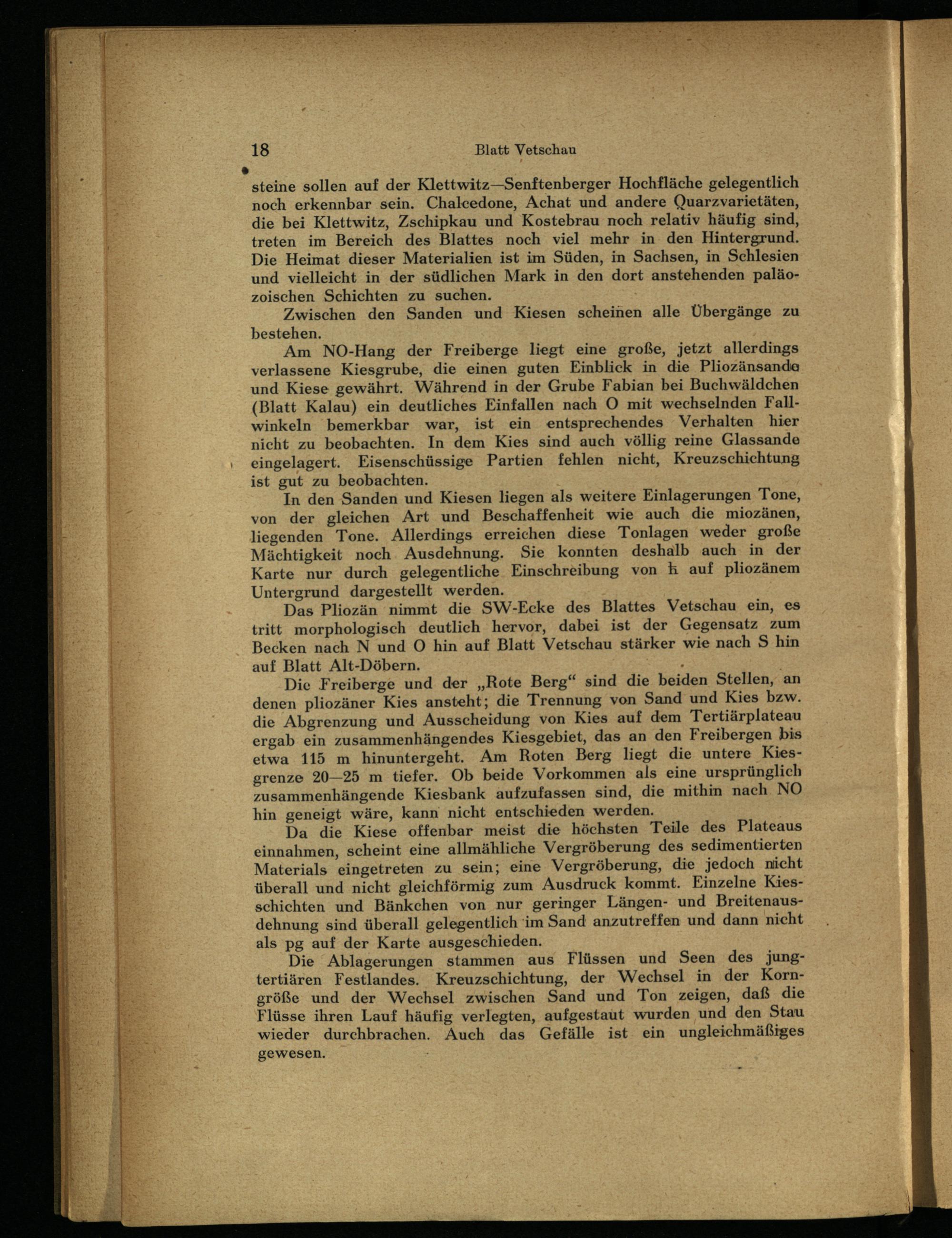 Das Pliozän nimmt die SW-Ecke des Blattes Vetschau ein, es tritt morphologisch deutlich hervor, dabei ist der Gegensatz zum Becken nach N und O hin auf Blatt Vetschau stärker wie nach S hin auf Blatt Alt-Döbern.. ı