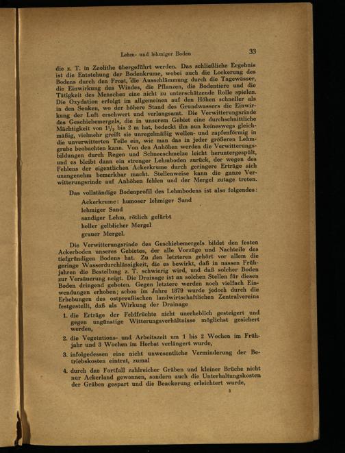 Die Verwitterungsrinde des Geschiebemergels bildet den festen Ackerboden unseres Gebietes, der alle Vorzüge und Nachteile des tiefgründigen Bodens hat. Zu den letzteren gehört vor allem die geringe Wasserdurchlässigkeit, die es bewirkt, daß in nassen Frühjahren die Bestellung z. T. schwierig wird, und daß solcher Boden zur Versäuerung neigt. Die Drainage ist an solchen Stellen für diesen Boden dringend geboten. Gegen letztere werden noch vielfach. Einwendungen erhoben; schon im Jahre 1879 wurde jedoch durch die Erhebungen des ostpreußischen landwirtschaftlichen Zentralvereins festgestellt, daß. als Wirkung der Drainage
