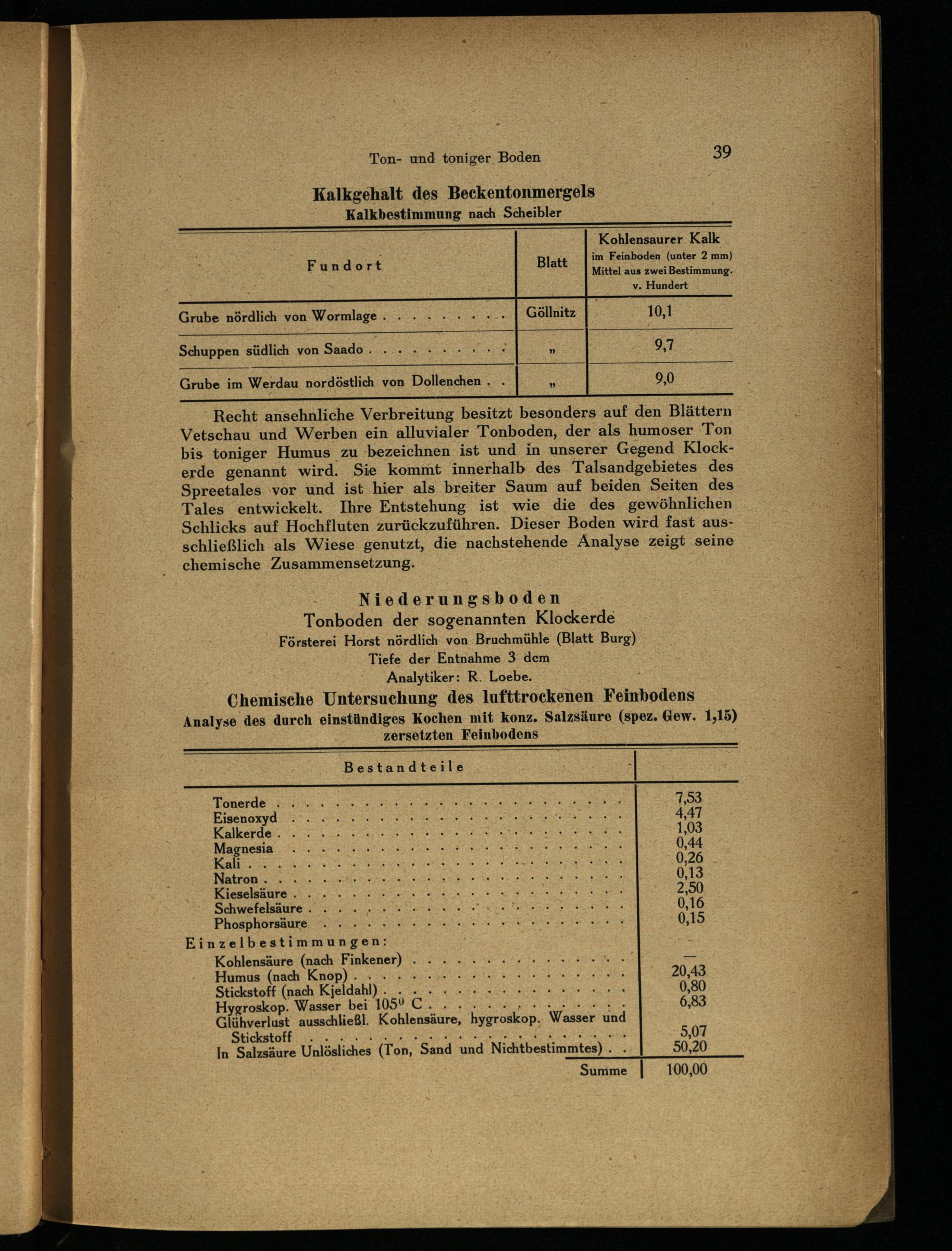 Niederungsboden Tonboden der sogenannten Klockerde Försterei Horst nördlich von Bruchmühle(Blatt Burg) Tiefe der Entnahme 3‘ dem Analytiker: R. Loebe. Chemische Untersuchung des lufttrockenen Feinbodens