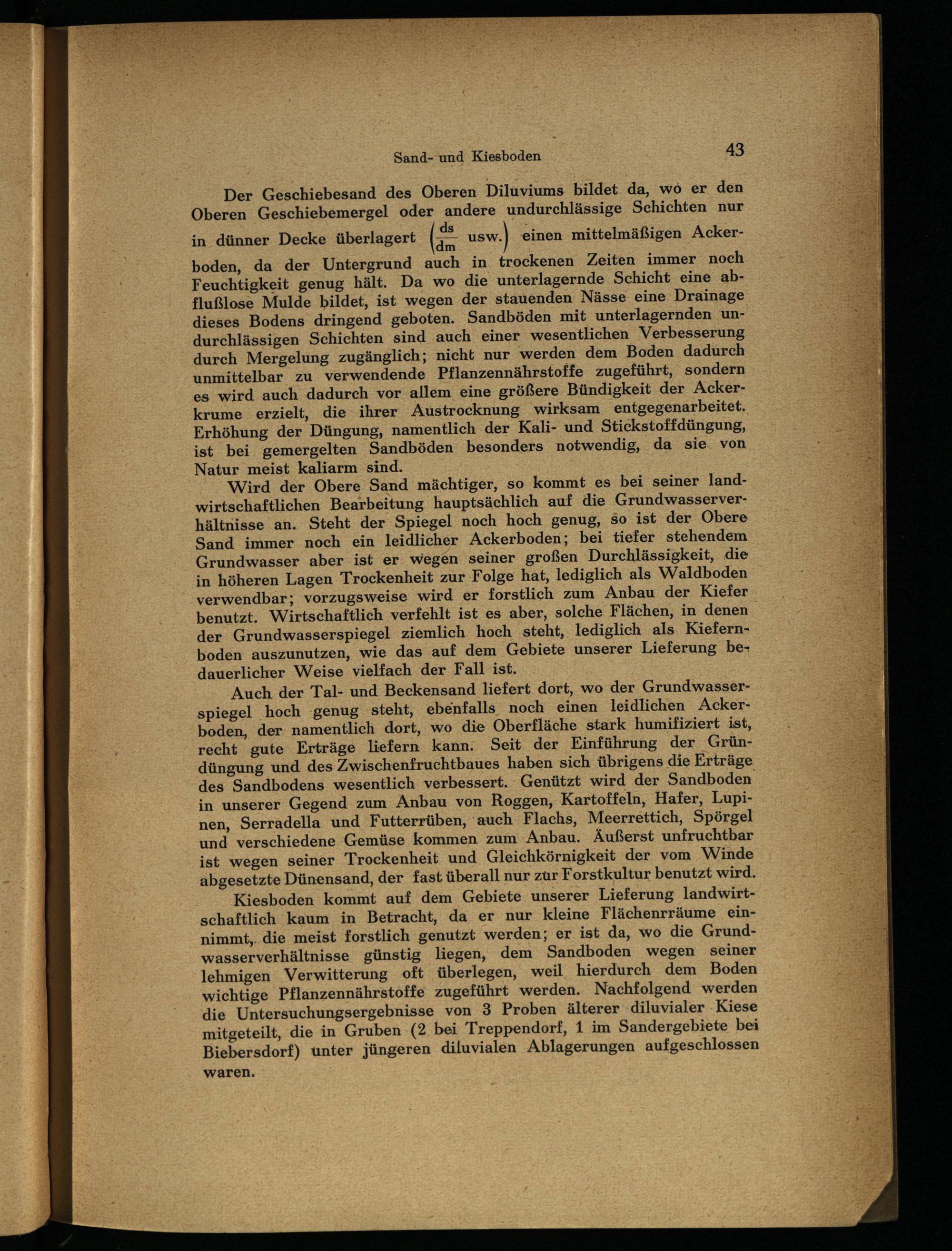 Wird der Obere Sand mächtiger, so kommt es bei seiner landwirtschaftlichen Bearbeitung hauptsächlich auf die Grundwasserverhältnisse an. Steht der Spiegel noch hoch genug, So ist der Obere Sand immer noch ein leidlicher Ackerboden; bei tiefer stehendem Grundwasser aber ist er wegen seiner großen Durchlässigkeit, die in höheren Lagen Trockenheit zur Folge hat, lediglich als Waldboden verwendbar; vorzugsweise wird er forstlich zum Anbau der Kiefer benutzt. Wirtschaftlich verfehlt ist es aber, solche Flächen, in denen der Grundwasserspiegel ziemlich hoch steht, lediglich als Kiefernboden auszunutzen, wie das auf dem Gebiete unserer Lieferung be+ dauerlicher Weise vielfach der Fall ist.