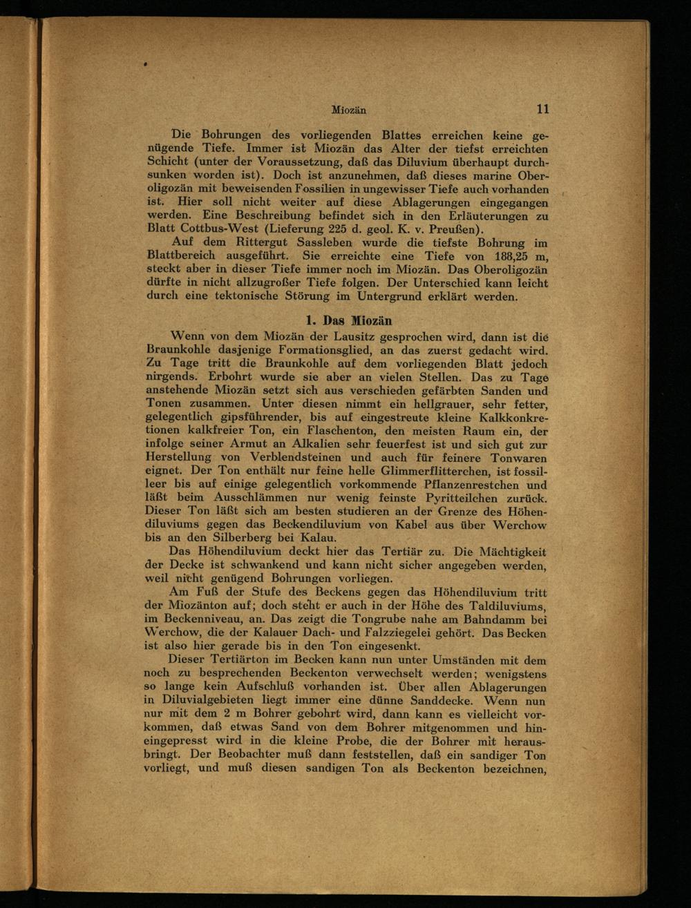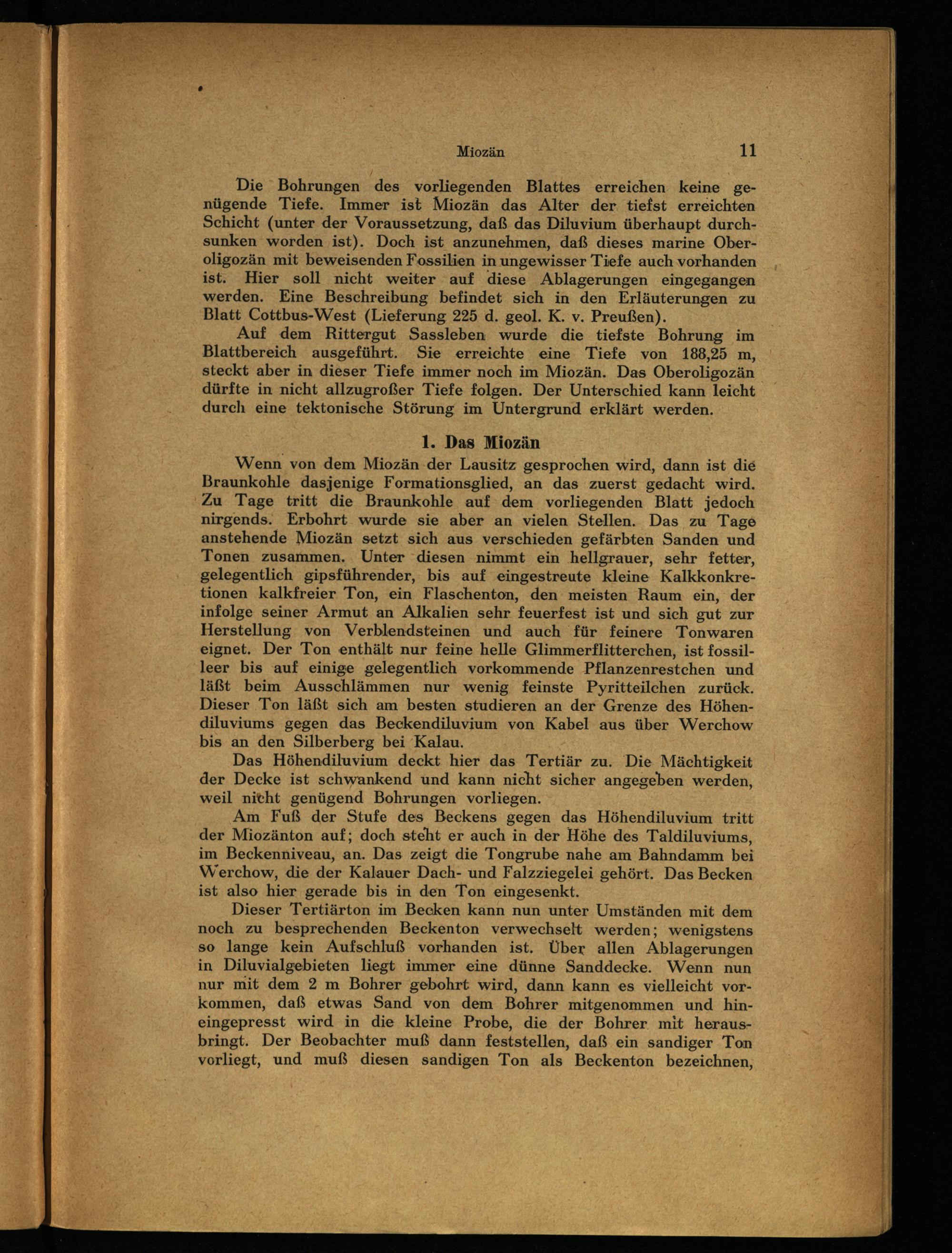 Wenn von dem Miozän der Lausitz gesprochen wird, dann ist die Braunkohle dasjenige Formationsglied, an das zuerst gedacht wird. Zu Tage tritt die Braunkohle auf dem vorliegenden Blatt jedoch nirgends. Erbohrt wurde sie aber an vielen Stellen. Das zu Tage anstehende Miozän setzt sich aus verschieden gefärbten Sanden und Tonen zusammen. Unter ‚diesen nimmt ein hellgrauer, sehr fetter, gelegentlich gipsführender, bis auf eingestreute kleine Kalkkonkretionen kalkfreier Ton, ein Flaschenton, den meisten Raum ein, der infolge seiner Armut an Alkalien sehr feuerfest ist und sich gut zur Herstellung von Verblendsteinen und auch für feinere Tonwaren eignet. Der Ton enthält nur feine helle Glimmerflitterchen, ist fossilleer bis auf einige gelegentlich vorkommende Pflanzenrestchen und läßt beim Ausschlämmen nur wenig feinste Pyritteilchen zurück. Dieser Ton läßt sich am besten studieren an der Grenze des Höhendiluviums gegen das Beckendiluvium von Kabel aus über Werchow bis an den Silberberg bei Kalau .