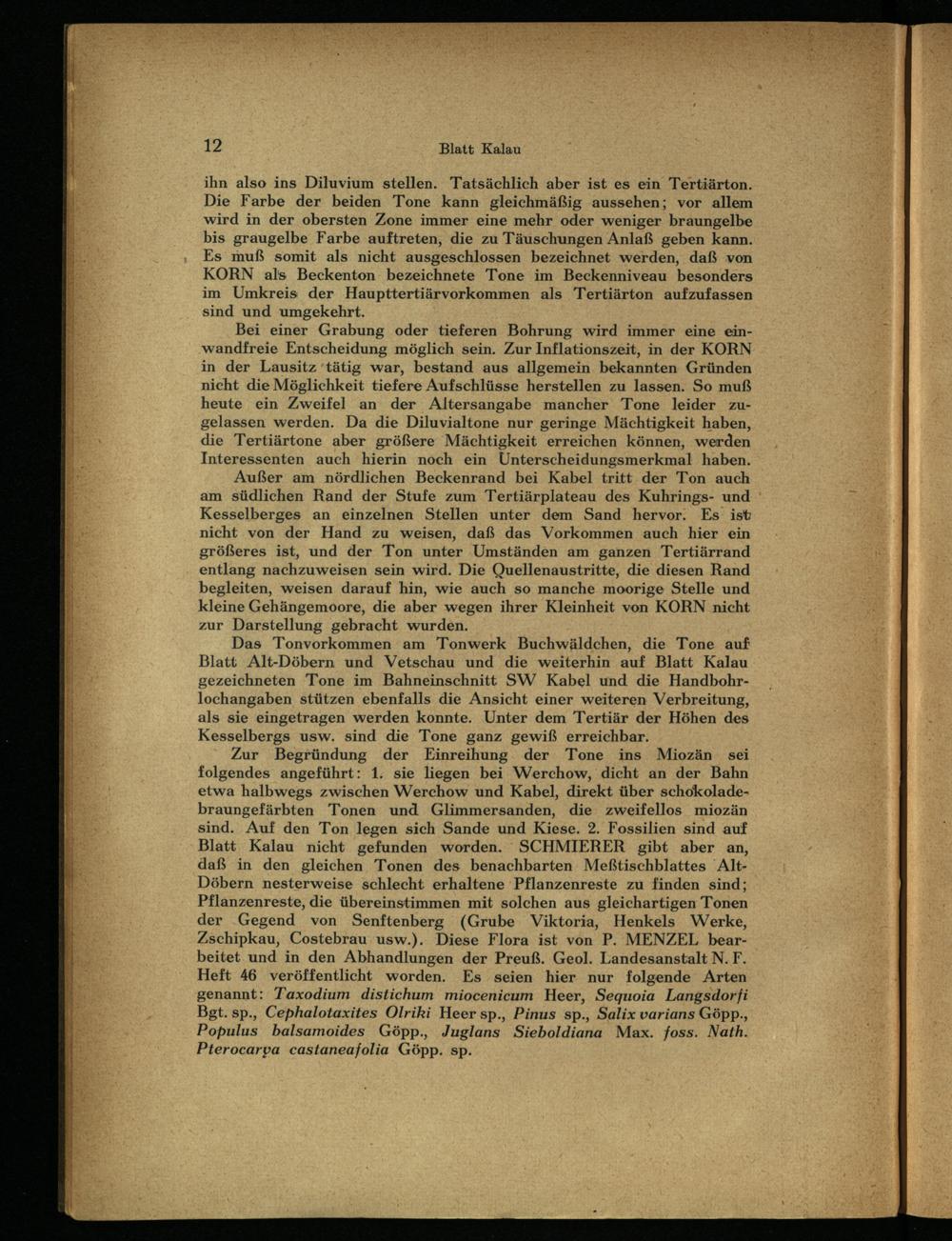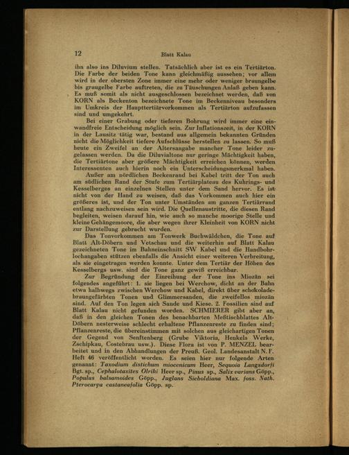 Zur Begründung der FEinreihung der Tone ins Miozän sei folgendes angeführt: 1. sie liegen bei Werchow, dicht an der Bahn etwa halbwegs zwischen Werchow und Kabel, direkt über schokoladebraungefärbten Tonen und Glimmersanden, die zweifellos miozän sind. Auf den Ton legen sich Sande und Kiese. 2. Fossilien sind auf Blatt Kalau nicht gefunden worden. SCHMIERER gibt aber an, daß in den gleichen Tonen des benachbarten Meßtischblattes Alt Döbern nesterweise schlecht erhaltene Pflanzenreste zu finden sind; Pflanzenreste, die übereinstimmen mit solchen aus gleichartigen Tonen der.Gegend von Senftenberg (Grube Viktoria, Henkels Werke, Zschipkau, Costebrau usw.). Diese Flora ist von P. MENZEL, bearbeitet und in den Abhandlungen der Preuß. Geol. Landesanstalt N. F. Heft 46 veröffentlicht worden. Es seien hier nur folgende Arten genannt: Taxodium distichum miocenicum Heer, Sequoia Langsdorfi Bgt. sp., Cephalotaxites Olriki Heer sp., Pinus sp., Salix varians Göpp-., Populus balsamoides Göpp., Juglans Sieboldiana Max. foss. Nath. Pterocarpa castaneafolia Göpp. sp.