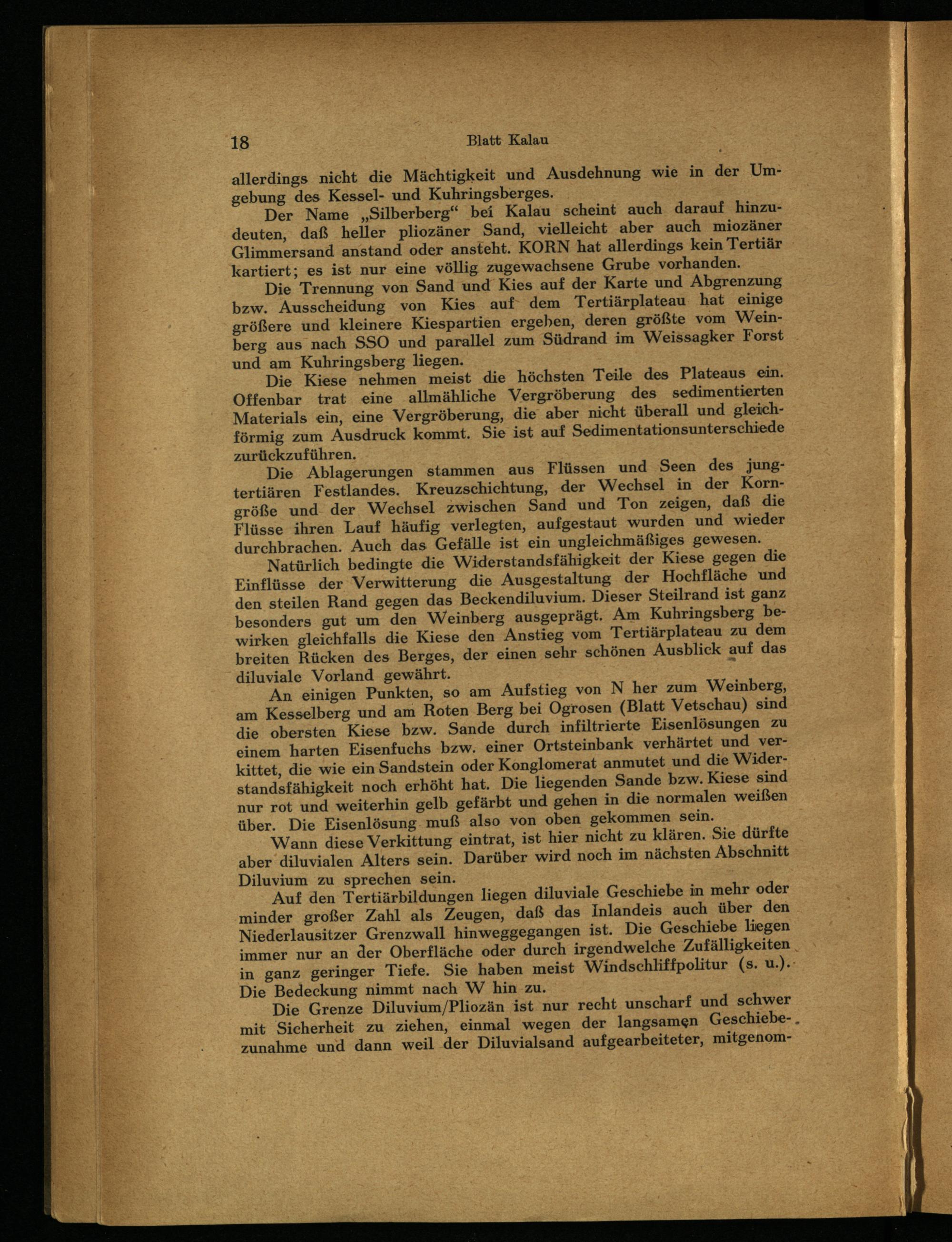 Der Name„Silberberg“ bei Kalau scheint auch darauf hinzudeuten, daß heller pliozäner Sand, vielleicht aber auch miozäner Glimmersand anstand oder ansteht. KORN hat allerdings kein Tertiär kartiert; es ist nur eine völlig zugewachsene Grube vorhanden.