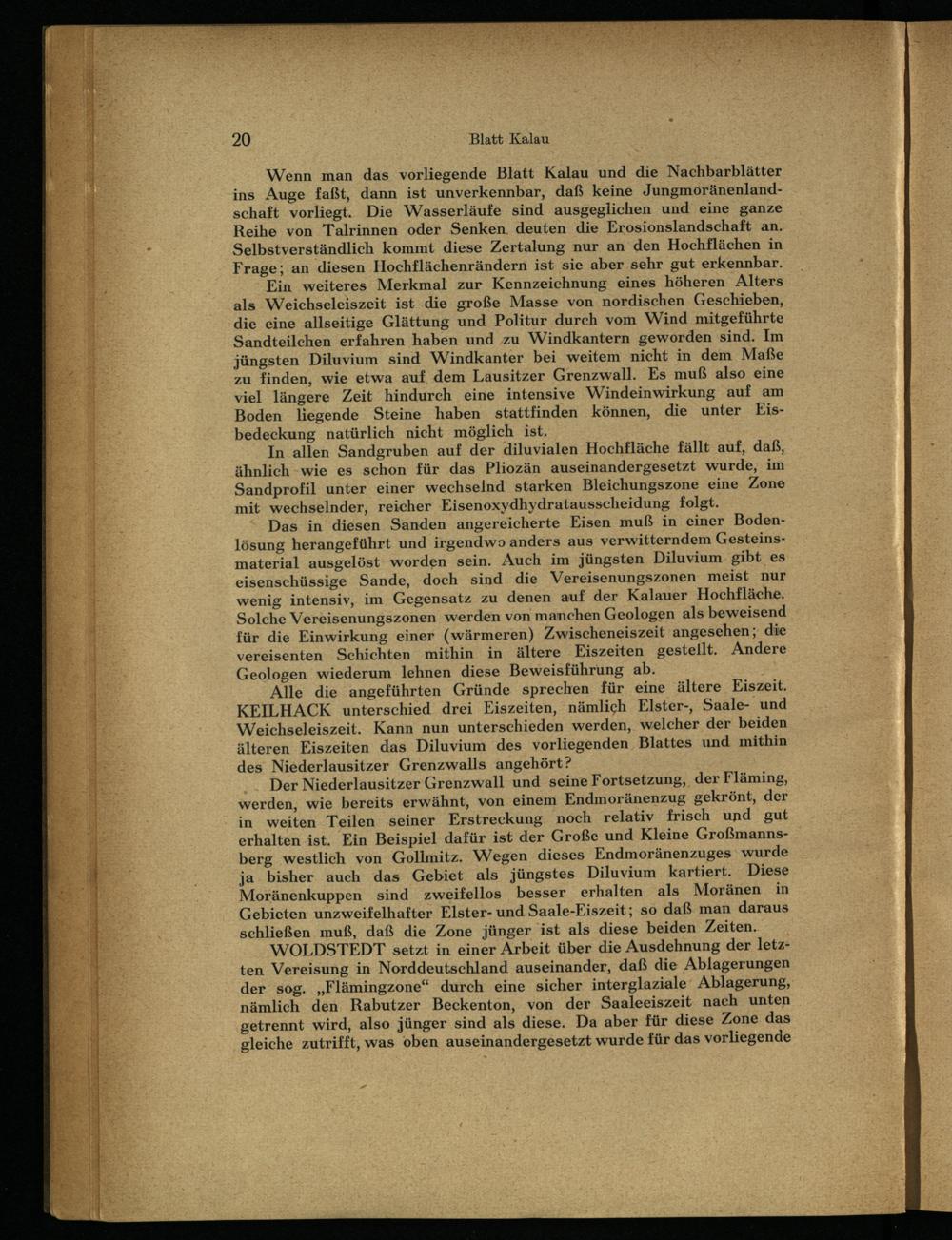 Wenn man das vorliegende Blatt Kalau und die Nachbarblätter ins Auge faßt, dann ist unverkennbar, daß keine Jungmoränenland­schaft vorliegt. Die Wasserläufe sind ausgeglichen und eine ganze Reihe von Talrinnen oder Senken. deuten die Erosionslandschaft an. Selbstverständlich kommt diese Zertalung nur an den Hochflächen in Frage; an diesen Hochflächenrändern ist sie aber sehr gut erkennbar.
