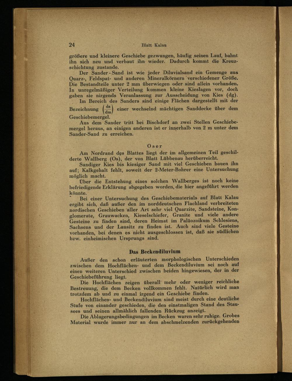 befriedigende Erklärung abgegeben worden, die hier angeführt werden könnte.\ ” Bei einer Untersuchung des Geschiebematerials auf Blatt Kalau ergibt sich, daß außer den im norddeutschen Flachland verbreiteten nordischen Geschieben‘aller Art sehr viel Quarzite, Sandsteine, Konglomerate, Grauwacken, Kieselschiefer, Granite und viele andere Gesteine zu finden sind, deren Heimat im Paläozoikum Schlesiens, Sachsens . und der Lausitz zu finden ist. Auch sind viele Gesteine vorhanden, bei denen es nicht ausgeschlossen ist, daß sie südlichen bzw. einheimischen Ursprungs sind,