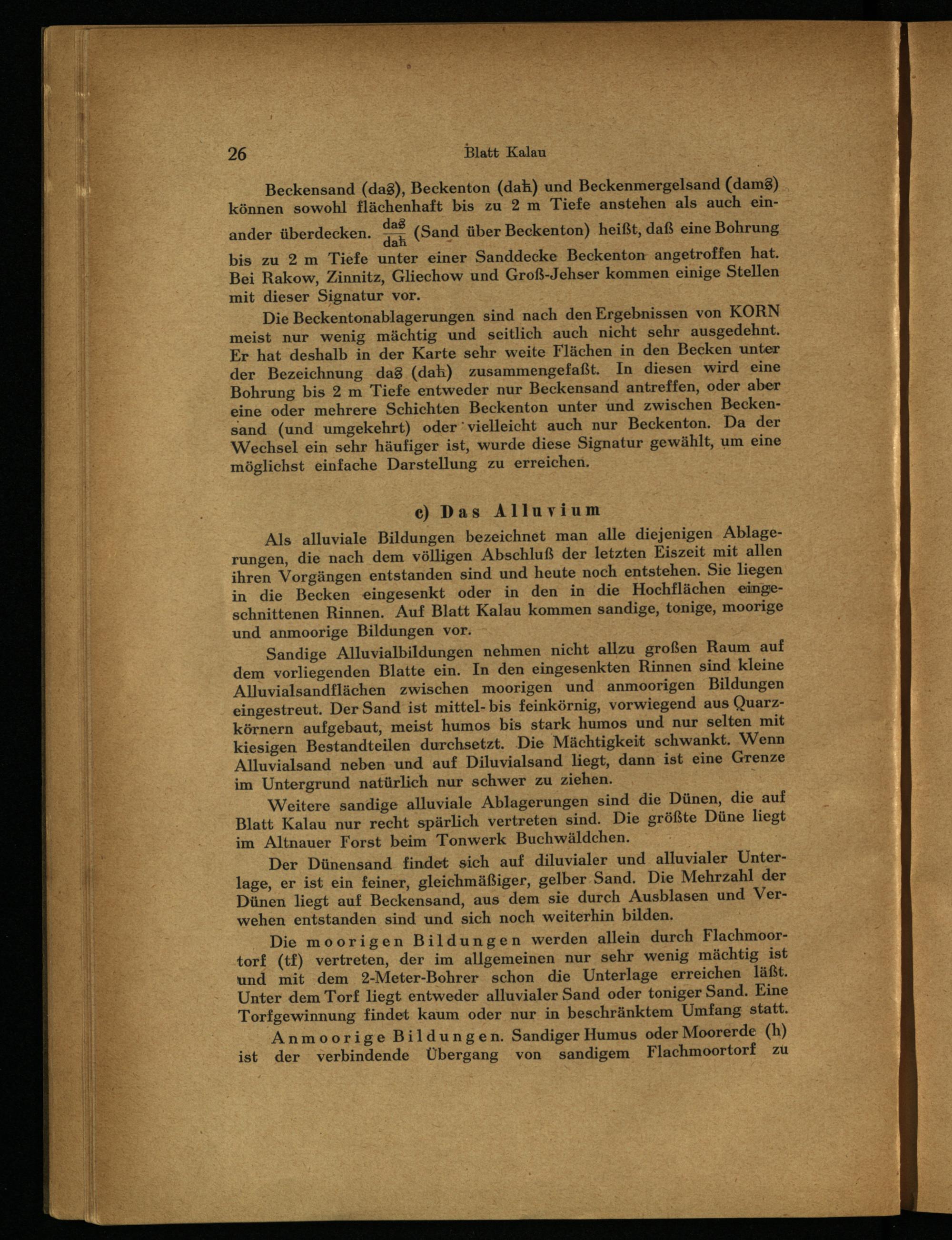 Als alluviale Bildungen bezeichnet man alle diejenigen Ablagerungen, die nach dem völligen Abschluß der letzten Eiszeit mit allen ihren Vorgängen entstanden sind und heute noch entstehen. Sie liegen in die Becken eingesenkt oder in den in die Hochflächen eingeschnittenen Rinnen. Auf Blatt Kalau kommen sandige, tonige, moorige und anmoorige Bildungen vor.