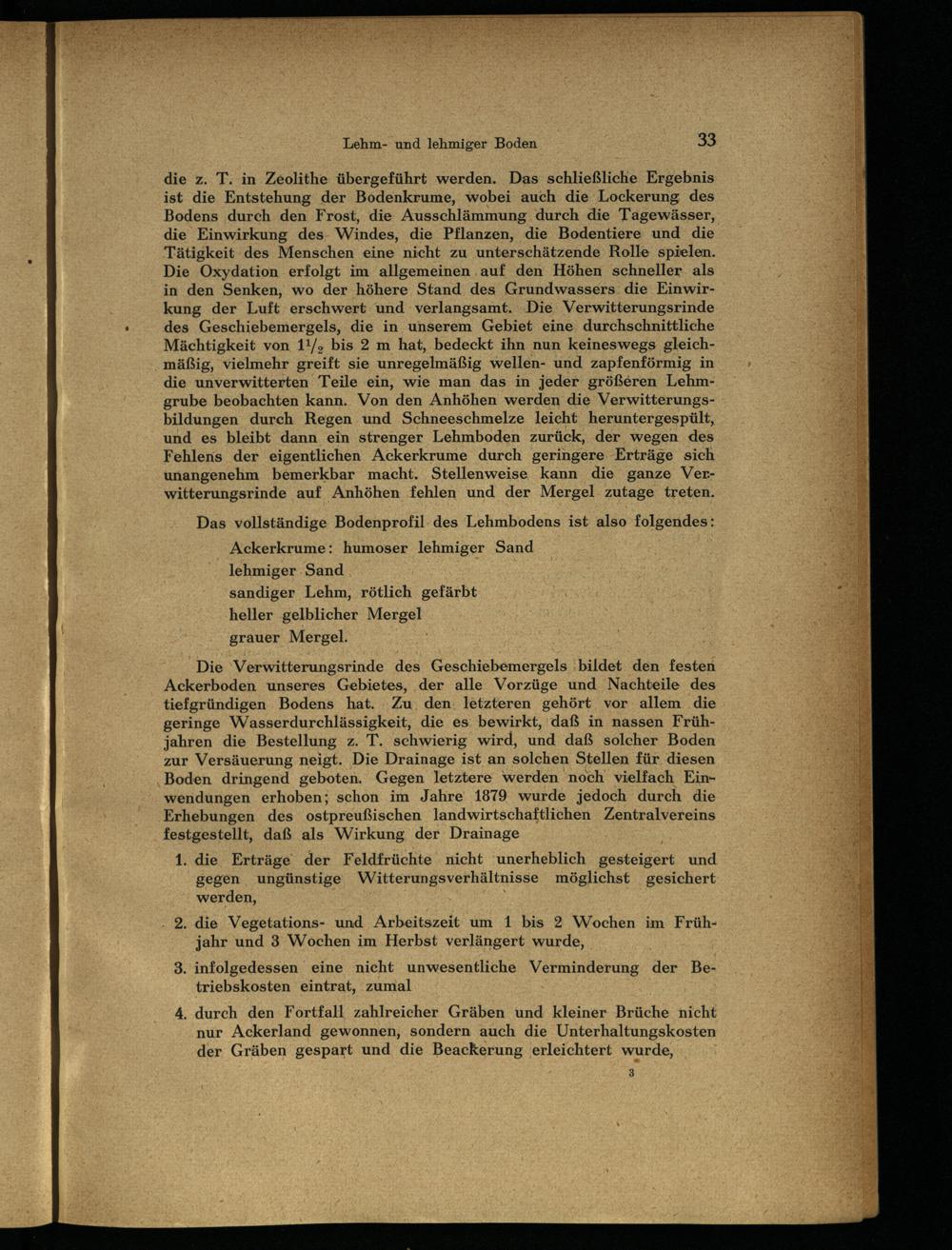 Die Verwitterungsrinde des Geschiebemergels‘bildet. den festen Ackerboden unseres Gebietes, der alle Vorzüge und Nachteile des tiefgründigen Bodens hat. Zu; den, letzteren gehört vor allem die geringe Wasserdurchlässigkeit, die es. bewirkt, daß in nassen Frühjahren die Bestellung z. T. schwierig wird, und. daß solcher Boden zur Versäuerung neigt. Die Drainage ist an solchen Stellen für diesen Boden dringend geboten. Gegen letztere werden noch vielfach Einwendungen erhoben; schon im Jahre 1879 wurde jedoch durch die Erhebungen des ostpreußischen landwirtschaftlichen Zentralvereins festgestellt, daß als Wirkung der Drainage