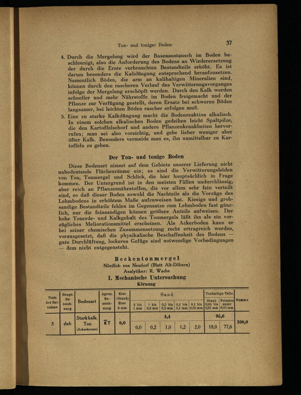 Diese Bodenart nimmt auf dem Gebiete unserer Lieferung nicht unbedeutende Flächenräume ein; es sind die Verwitterungsböden von Ton, Tonmergel‘ und Schlick, die hier hauptsächlich in Frage kommen. Der Untergrund ist in den meisten Fällen undurchlässig, aber reich an Pflanzennährstoffen,. die vor allem sehr fein verteilt sind, so daß dieser Boden, sowohl die Nachteile als die Vorzüge des Lehmbodens in erhöhtem Maße aufzuweisen hat. Kiesige und grobsandige, Bestandteile fehlen im Gegensatze zum Lehmboden fast gänzlich, nur die feinsandigen können größere Anteile aufweisen. Der hohe Tonerde- und Kalkgehalt des Tonmergels läßt ihn als ein vorzügliches Meliorationsmittel erscheinen. Als Ackerboden kann er. bei seiner chemischen Zusammensetzung recht ertragreich werden, vorausgesetzt, daß die physikalische Beschaffenheit des Bodens— gute Durchlüftung, lockeres Gefüge sind notwendige Vorbedingungen — dem nicht entgegensteht.