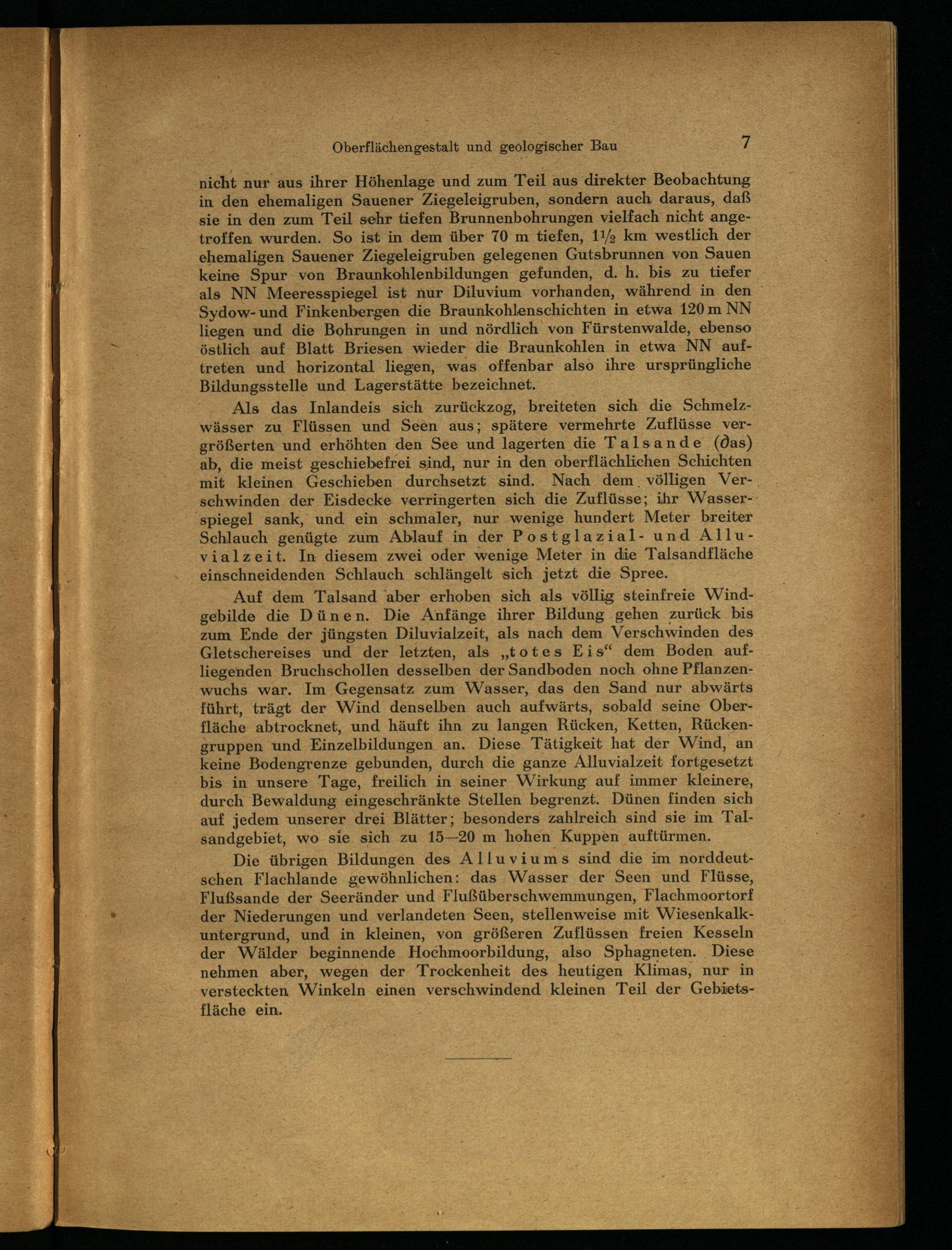 nicht nur aus ihrer Höhenlage und zum Teil aus direkter Beobachtung in den ehemaligen Sauener Ziegeleigruben, sondern auch daraus, daß sie in den zum Teil sehr tiefen Brunnenbohrungen vielfach nicht angetroffen wurden. So ist in dem über 70 m tiefen, 11% km westlich der ehemaligen Sauener Ziegeleigruben gelegenen Gutsbrunnen von Sauen keine Spur von Braunkohlenbildungen gefunden, d. h. bis zu tiefer als NN Meeresspiegel ist nur Diluvium vorhanden, während in den; Sydow- und Finkenbergen die Braunkohlenschichten in etwa 120 m NN liegen und die Bohrungen in und nördlich von Fürstenwalde , ebenso östlich auf Blatt Briesen wieder die Braunkohlen in etwa NN auftreten und horizontal liegen, was offenbar also ihre ursprüngliche Bildungsstelle und Lagerstätte bezeichnet.