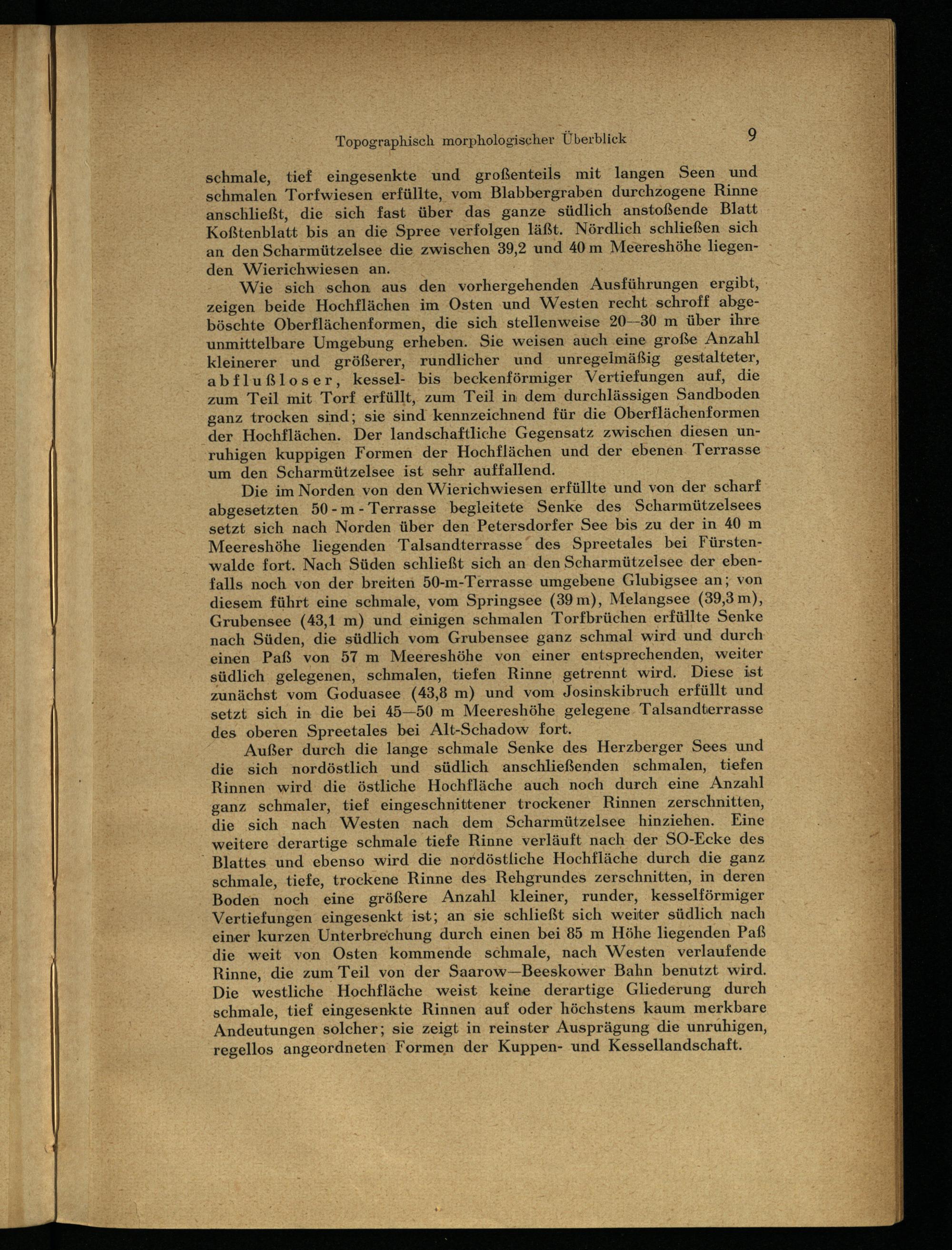 Die im Norden von den Wierichwiesen erfüllte und von der scharf abgesetzten 50-m- Terrasse begleitete Senke des Scharmützelsees setzt sich nach Norden über den Petersdorfer See bis zu der in 40 m Meereshöhe liegenden Talsandterrasse‘ des Spreetales bei Fürsten walde fort. Nach Süden schließt sich an den Scharmützelsee der ebenfalls noch von der breiten 50-m-Terrasse umgebene Glubigsee an; von diesem führt eine schmale, vom Springsee(39 m), Melangsee(39,3 m), Grubensee(43,1 m) und einigen schmalen Torfbrüchen erfüllte Senke nach Süden, die südlich vom Grubensee ganz schmal wird und durch einen. Paß von 57 m Meereshöhe von einer entsprechenden, weiter südlich gelegenen, schmalen, tiefen Rinne getrennt wird. Diese ist zunächst vom Goduasee(43,8 m) und vom Josinskibruch erfüllt und setzt sich in die bei 45—50 m Meereshöhe gelegene. Talsandterrasse des oberen Spreetales bei Alt-Schadow fort.