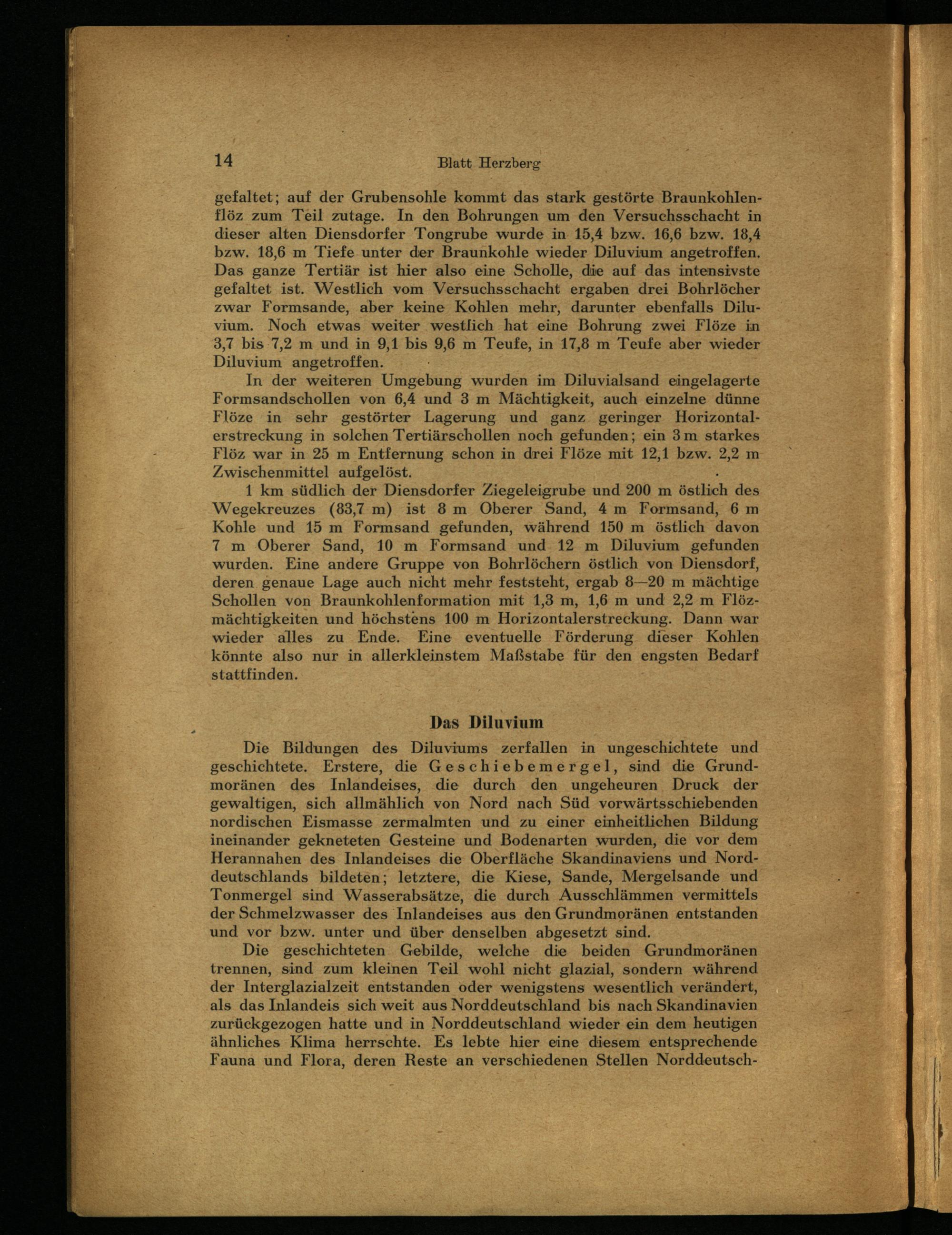 gefaltet; auf der Grubensohle kommt das stark gestörte Braunkohlenflöz zum Teil zutage. In den Bohrungen um den Versuchsschacht in dieser alten Diensdorfer Tongrube wurde in 15,4 bzw. 16,6 bzw. 18,4 bzw. 18,6 m Tiefe unter der Braunkohle wieder Diluvium angetroffen, Das ganze Tertiär ist hier also eine Scholle, die auf das intensivste gefaltet ist. Westlich vom Versuchsschacht ergaben drei Bohrlöcher zwar Formsande, aber keine Kohlen mehr, darunter ebenfalls Diluvium. Noch etwas weiter westlich hat eine Bohrung zwei Flöze in 3,7 bis 7,2 m und in 9,1 bis 9,6 m Teufe, in 17,8 m Teufe aber wieder Diluvium angetroffen.