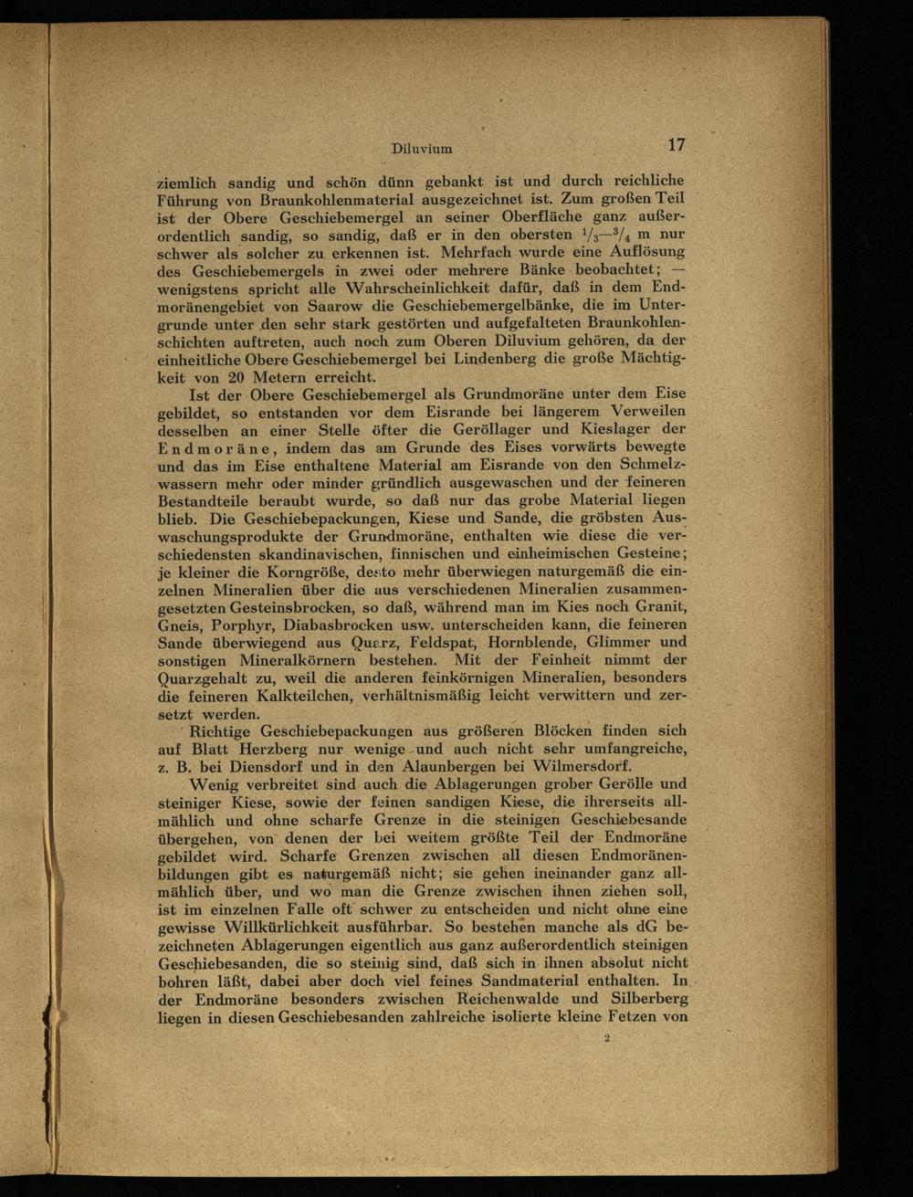 Ist der Obere Geschiebemergel als Grundmoräne unter dem Eise gebildet, so entstanden vor dem Eisrande bei längerem Verweilen desselben an einer Stelle öfter die Geröllager und Kieslager der Endmoräne, indem das am Grunde des Eises vorwärts bewegte und das im Eise enthaltene Material am Eisrande von den Schmelzwassern mehr oder minder gründlich ausgewaschen und der feineren Bestandteile beraubt wurde, so daß nur das grobe Material. liegen blieb. Die Geschiebepackungen, Kiese und Sande, die gröbsten Auswaschungsprodukte der Grundmoräne, enthalten wie diese die verschiedensten skandinavischen, finnischen und einheimischen Gesteine; je kleiner die Korngröße, desto mehr überwiegen naturgemäß die einzelnen Mineralien über die aus verschiedenen Mineralien zusammengesetzten Gesteinsbrocken, so daß, während man im Kies noch Granit, Gneis, Porphyr, Diabasbrocken usw. unterscheiden kann, die feineren Sande überwiegend aus Quarz, Feldspat, Hornblende, Glimmer und sonstigen Mineralkörnern bestehen. Mit der Feinheit nimmt der Quarzgehalt zu, weil die anderen feinkörnigen Mineralien, besonders die feineren Kalkteilchen, verhältnismäßig leicht verwittern und zersetzt werden.