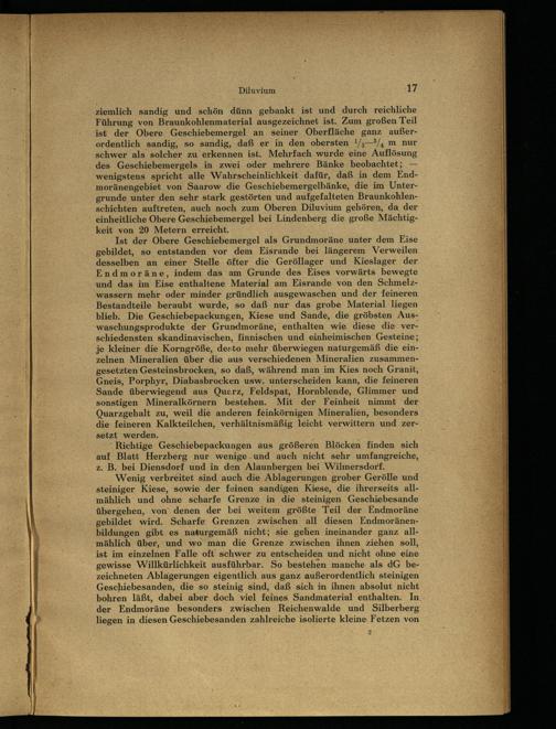 ziemlich sandig und schön dünn gebankt ist und durch reichliche Führung von Braunkohlenmaterial ausgezeichnet ist. Zum großen Teil ist der Obere Geschiebemergel an seiner Oberfläche ganz außerordentlich sandig, so sandig, daß er in den obersten!/;—°/, m nur schwer als solcher zu erkennen ist. Mehrfach wurde eine Auflösung des Geschiebemergels in zwei oder mehrere Bänke beobachtet;— wenigstens spricht alle Wahrscheinlichkeit dafür, daß in dem Endmoränengebiet von Saarow die Geschiebemergelbänke, die im Untergrunde unter den sehr stark gestörten und aufgefalteten Braunkohlenschichten auftreten, auch noch zum Oberen Diluvium gehören, da der einheitliche Obere Geschiebemergel bei Lindenberg die große Mächtigkeit von 20 Metern erreicht.