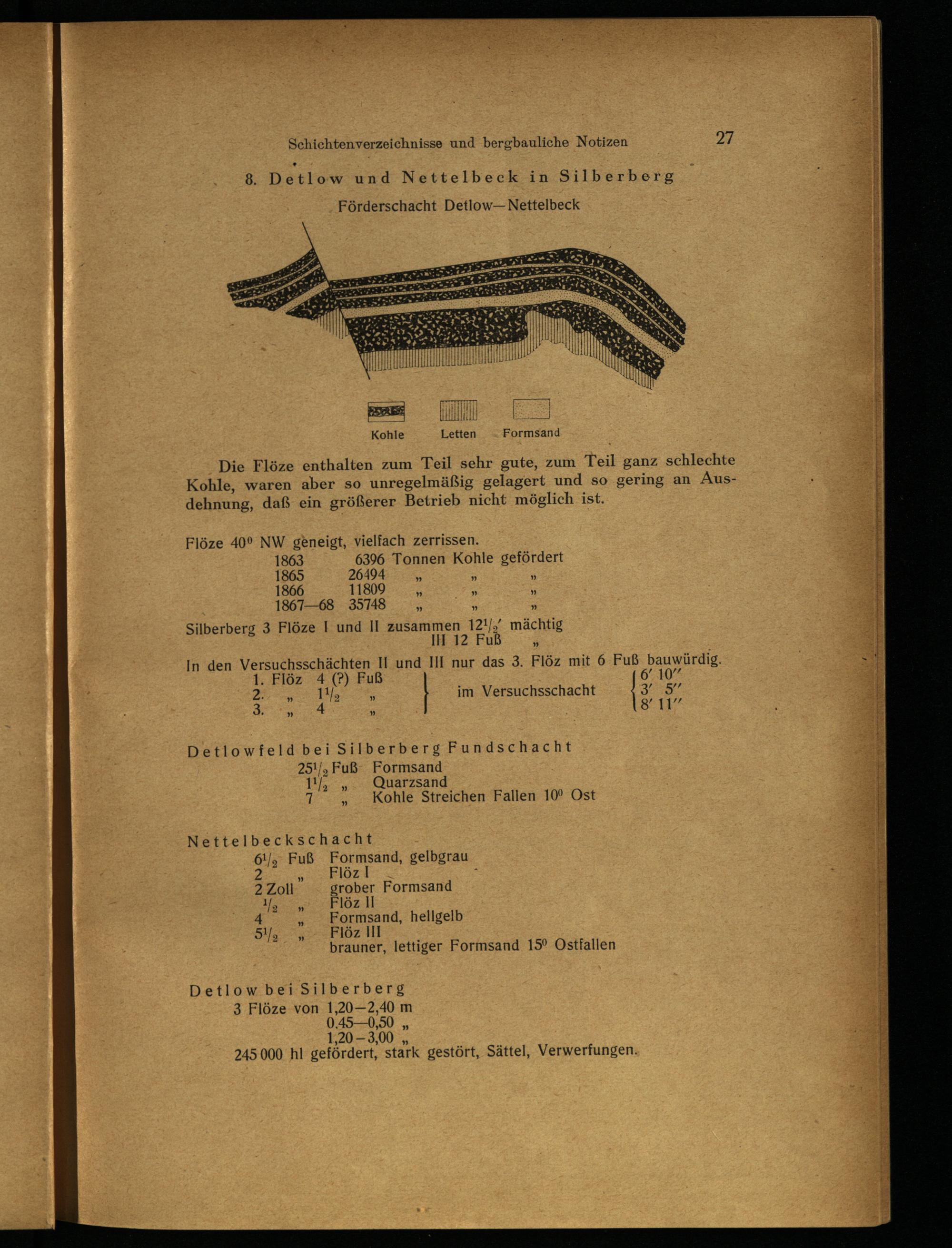 Flöze 40° NW geneigt, vielfach zerrissen. 1863 6396 Tonnen Kohle gefördert 1865 26494: 1866 11809© 1867—68 35748 N