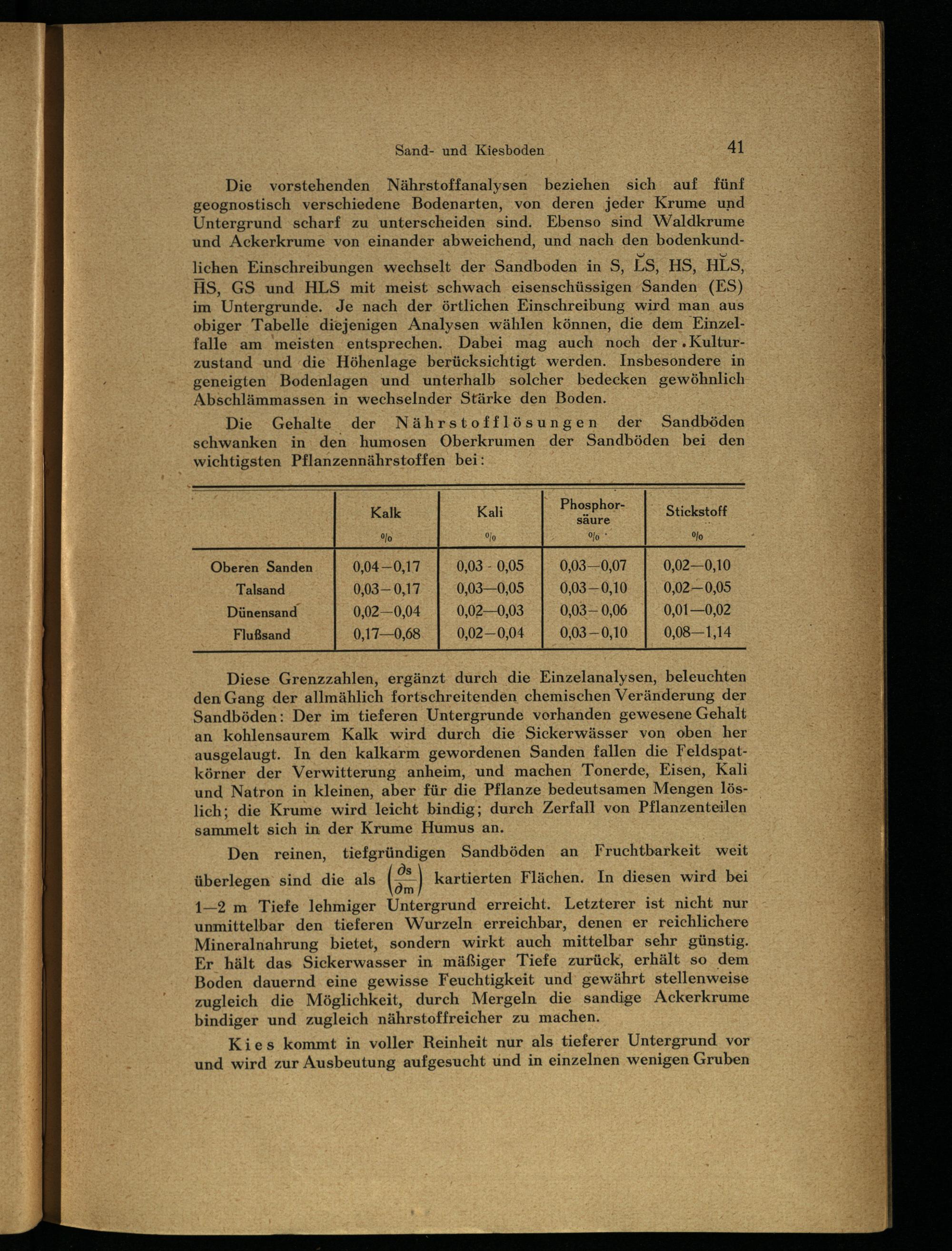 Diese Grenzzahlen, ergänzt durch die Einzelanalysen, beleuchten den Gang der allmählich fortschreitenden chemischen Veränderung der Sandböden: Der im tieferen Untergrunde vorhanden gewesene Gehalt an kohlensaurem Kalk wird durch die Sickerwässer von oben her ausgelaugt. In den kalkarm gewordenen Sanden fallen die Feldspatkörner der Verwitterung anheim, und machen Tonerde, Eisen, Kali und Natron in kleinen, aber für die Pflanze bedeutsamen Mengen löslich; die Krume wird leicht bindig; durch Zerfall von Pflanzenteilen sammelt sich in der Krume Humus an.