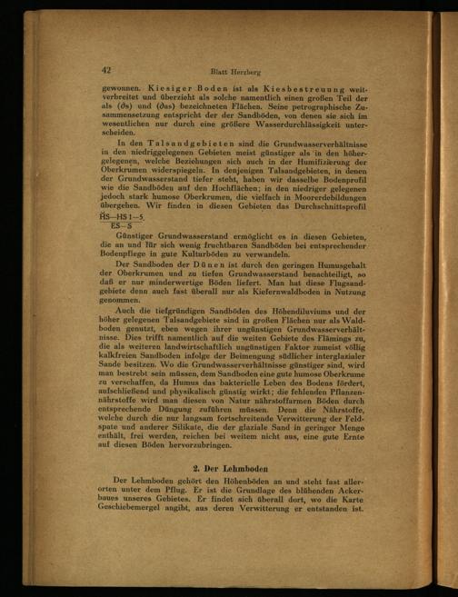 gewonnen. Kiesiger Boden ist als Kiesbestreuung weitverbreitet und überzieht als solche namentlich einen großen Teil der als(0s) und(das) bezeichneten Flächen. Seine petrographische Zusammensetzung entspricht der der Sandböden, von denen sie sich im wesentlichen nur durch eine größere Wasserdurchlässigkeit unterscheiden.;