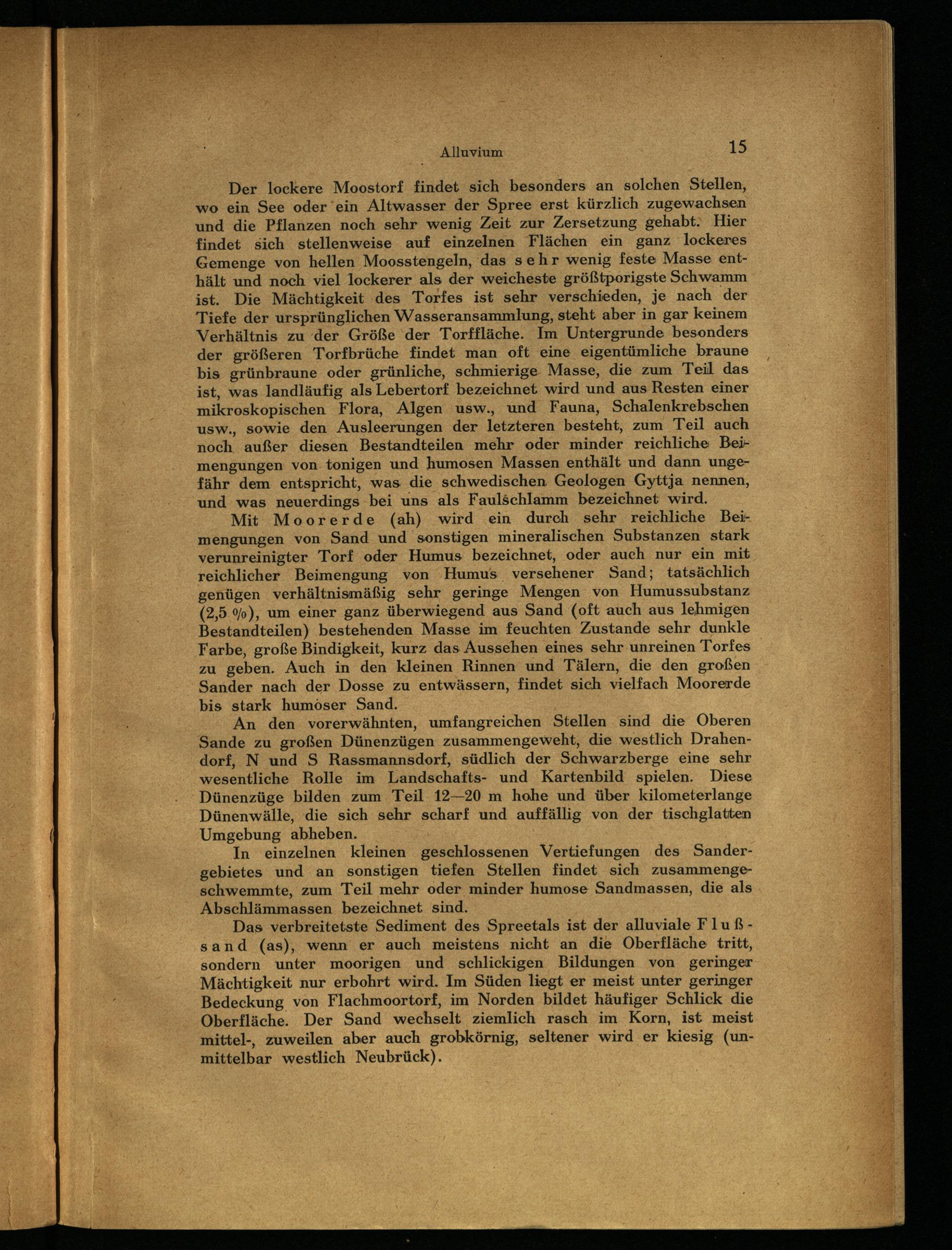 Der lockere Moostorf findet sich besonders an solchen Stellen, wo ein See oder ein Altwasser der Spree erst kürzlich zugewachsen und die Pflanzen noch sehr wenig Zeit zur Zersetzung gehabt; Hier findet sich stellenweise auf einzelnen Flächen ein ganz lockeres Gemenge von hellen Moosstengeln, das sehr wenig feste Masse enthält und noch viel lockerer als der weicheste größtporigste Schwamm ist. Die Mächtigkeit des Torfes ist sehr verschieden, je nach der Tiefe der ursprünglichen Wasseransammlung, steht aber in gar keinem Verhältnis zu der Größe‘der Torffläche. Im Untergrunde besonders der größeren Torfbrüche findet man oft eine eigentümliche braune bis grünbraune oder grünliche, schmierige Masse, die zum Teil das ist, was landläufig als Lebertorf bezeichnet wird und aus Resten einer mikroskopischen Flora, Algen usw., und Fauna, Schalenkrebschen usw., sowie den Ausleerungen der letzteren besteht, zum Teil auch noch. außer diesen Bestandteilen mehr oder minder reichliche Beimengungen von. tonigen und humosen Massen enthält und dann ungefähr dem entspricht, was die schwedischen Geologen Gyttja nennen, und was neuerdings bei uns als Faulschlamm bezeichnet wird.